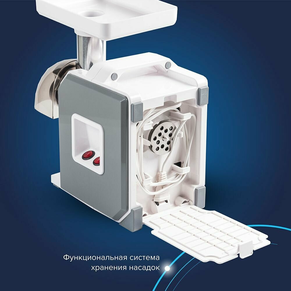 Многофункциональность: в комплект поставки входят перфорированные диски для фарша и насадки для приготовления колбас, что делает эту мясорубку универсальным помощником на кухне.