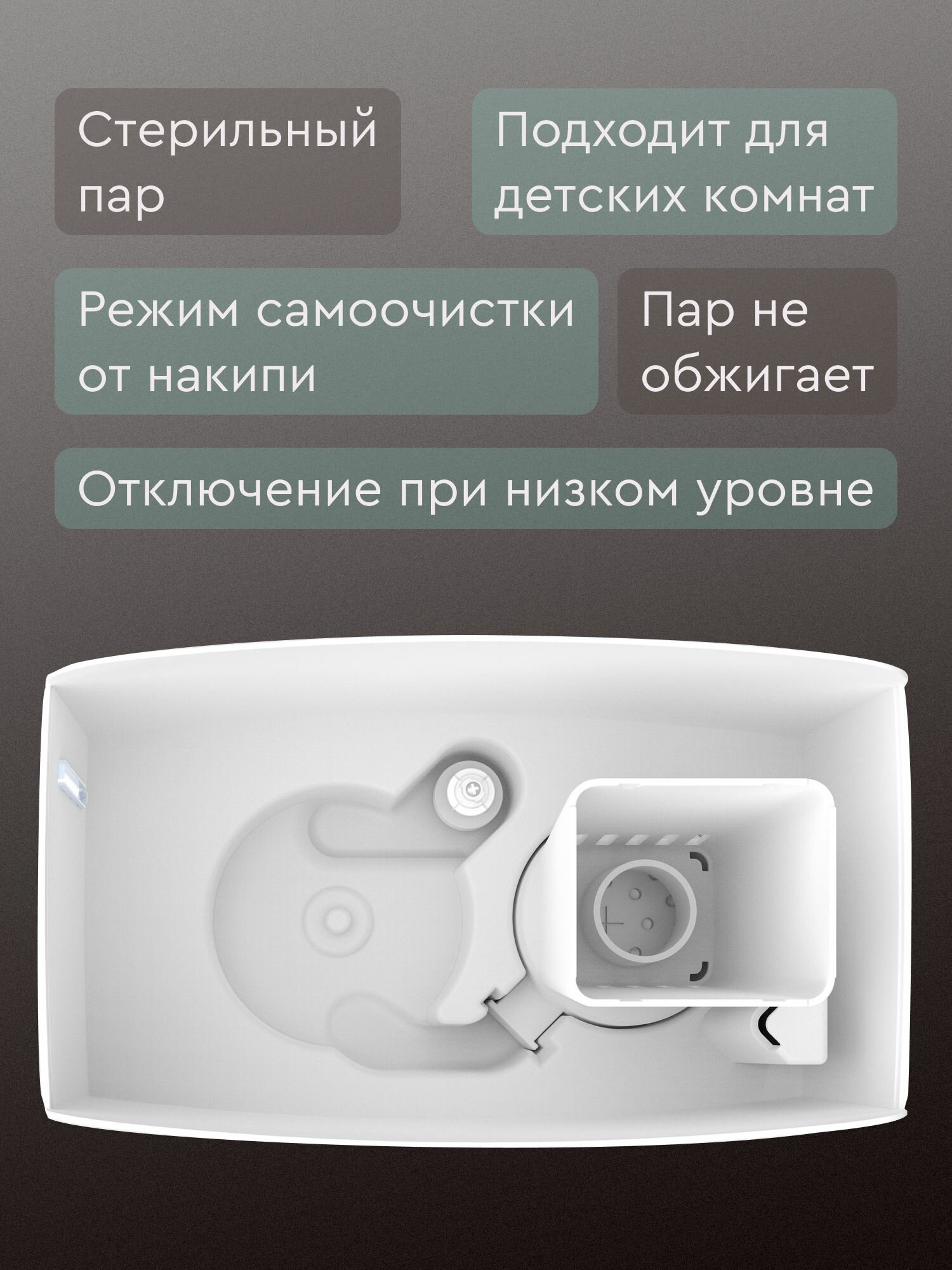 Надежный и эффективный паровой увлажнитель .Надежность, простота и стабильная производительность.Простое и удобное механическое управление позволяет просто устанавливать один из 5 режимов увлажнения воздуха. Строгий и изящный форм-фактор вписывается в любой интерьер и дома, и офиса. Идеально подходит для детских комнат.