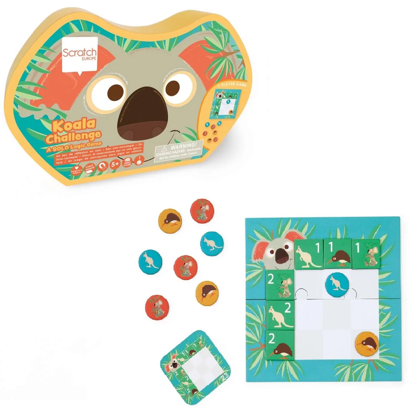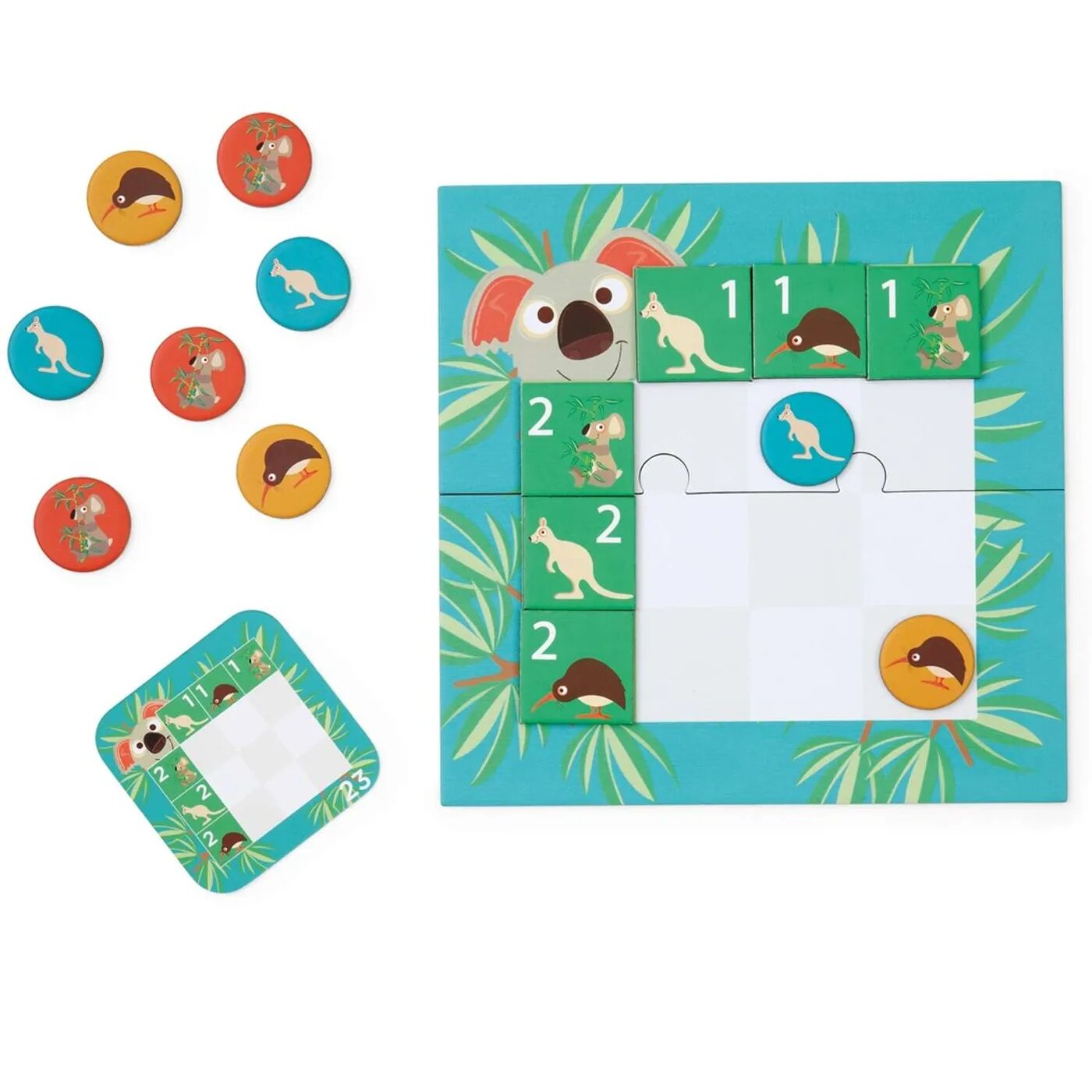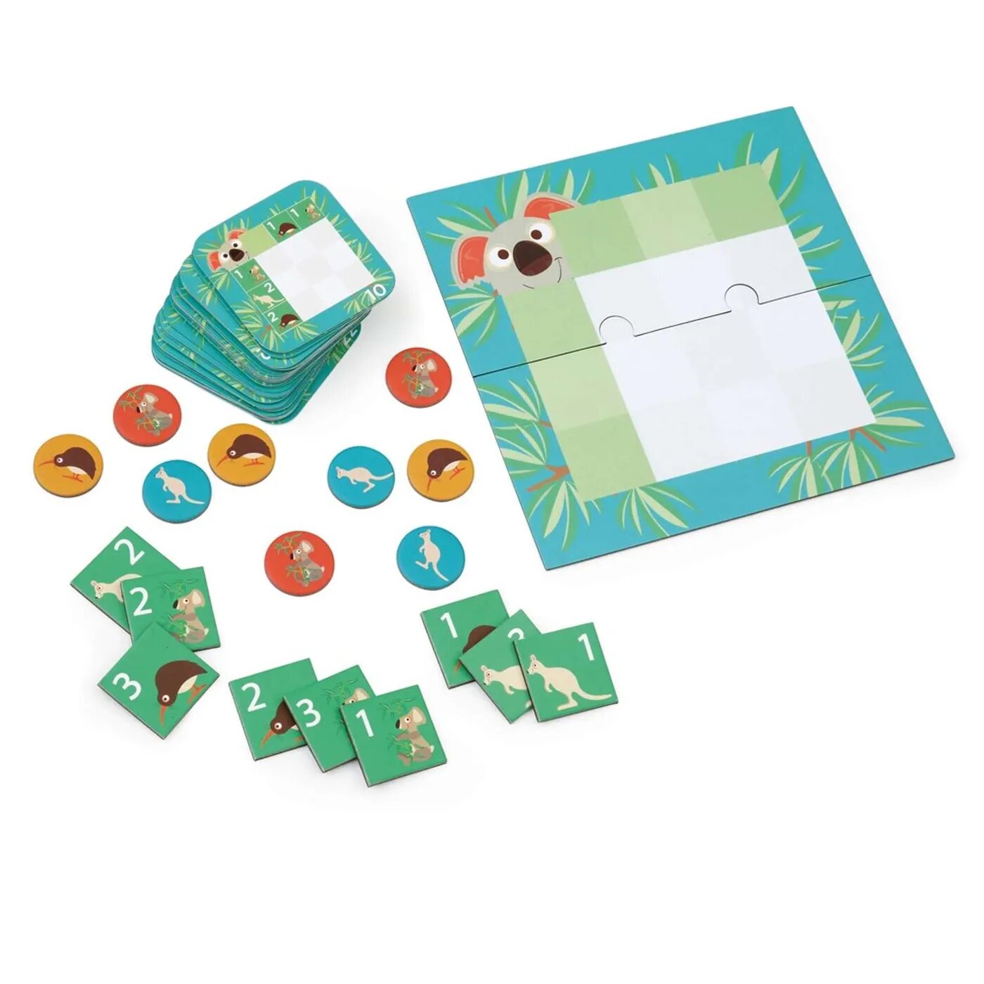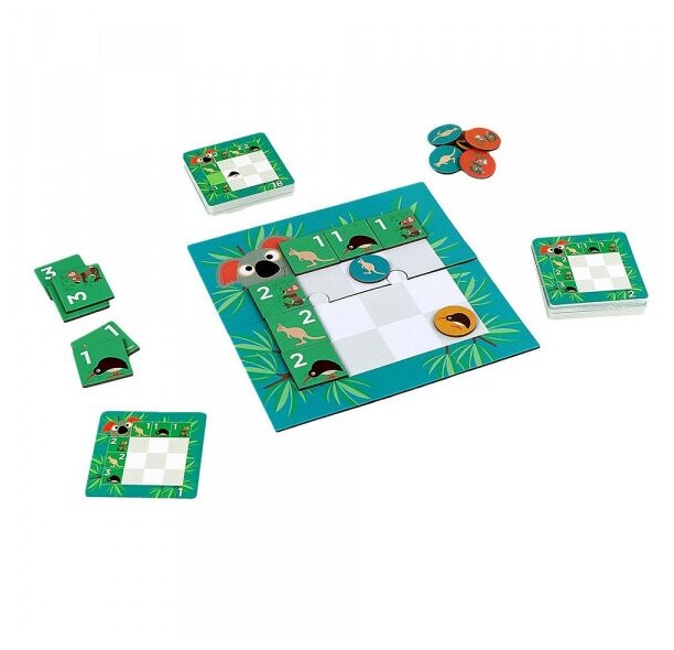 Попробуйте несколько забавных заданий с коалами, киви и кенгуру! Нарисуйте карту вызова и положите ее на свою доску. Найдите правильное решение, чтобы поместить на доску 3 коалы, 3 киви и 3 кенгуру. Игра содержит 30 задач, для решения которых ваш ребенок должен найти решение различными способами. Вызов Коалы стимулирует зрительное восприятие вашего ребенка, пространственное восприятие и логическое мышление. Подходит для детей в возрасте от 5 лет и старше.