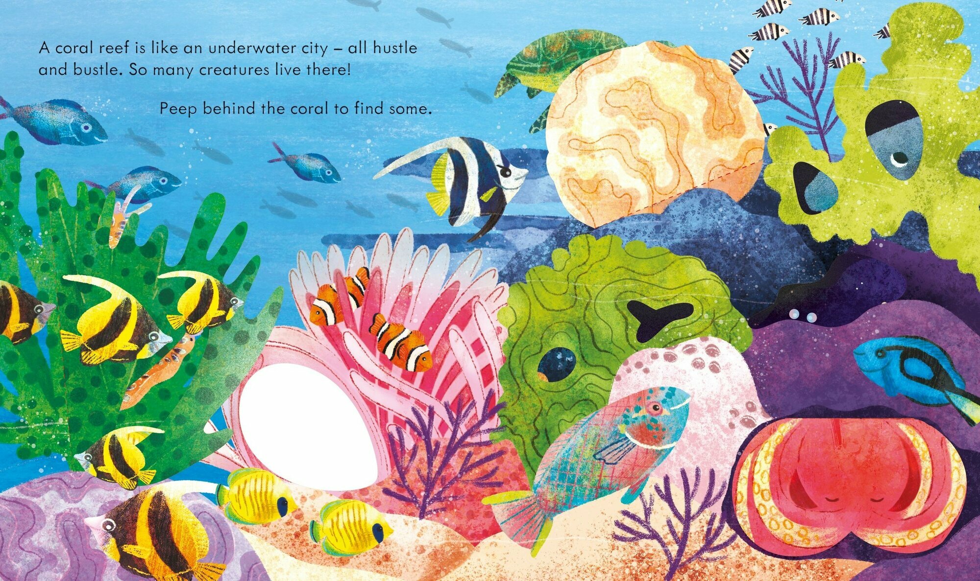 Peep through holes and under flaps to discover the wonders of a coral reef. Find teeny-tiny camouflaged seahorses, an octopus in its den, and a wealth of other creatures that live in this habitat. See how a clownfish looks after its babies, see what comes out on the reef at night and learn what coral really is. A great introduction to this beautiful, endangered ecosystem.