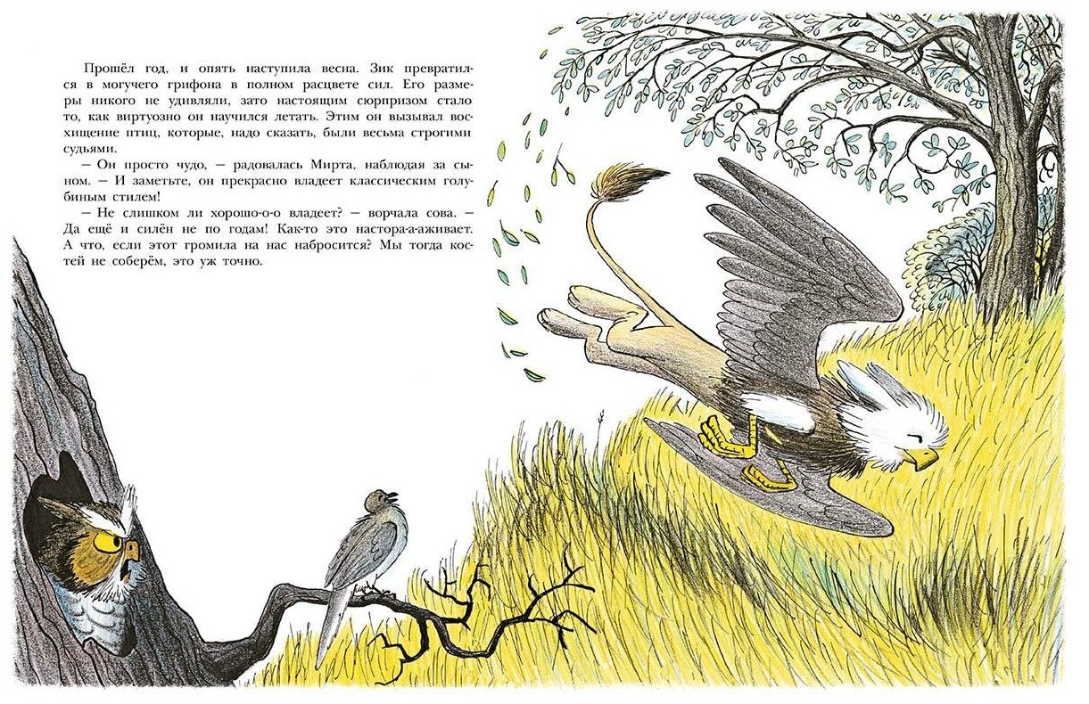 Голубка Мирта находит в пещере необычное яйцо и решает его высидеть. К ужасу всего птичьего сообщества, из яйца вылупляется грифончик — наполовину орел, наполовину лев. Старая сова считает, что надо поскорее избавиться от этого уродца, иначе им всем несдобровать. Но Мирта грудью встает на защиту малыша и с радостью берется за его воспитание. Спустя год возмужавший грифон избавляет птиц от хищных волков и лисиц.