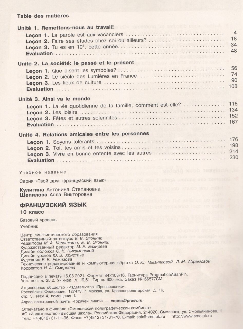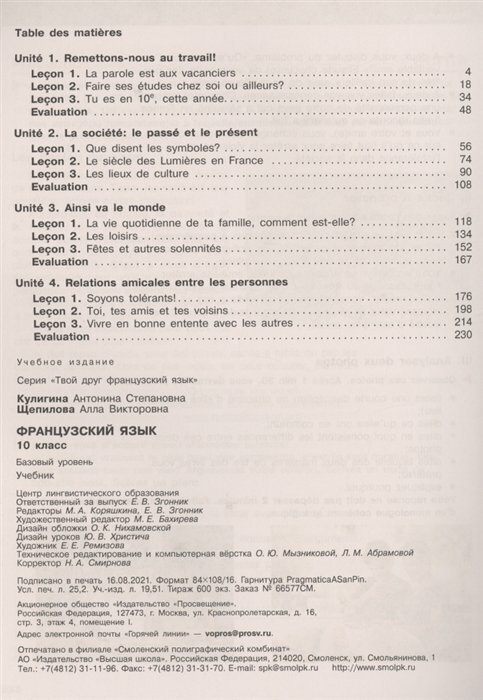 Данный учебник является основным компонентом учебно-методического комплекта по французскому языку для 10 класса общеобразовательных организаций линии "Твой друг французский язык". Он создан в соответствии с требованиями Федерального государственного образовательного стандарта среднего общего образования. Основными особенностями курса являются социокультурная направленность, представленная в духе диалога культур России и Франции; дифференцированный подход к организации образовательного процесса; система заданий, последовательно готовящих к Единому государственному экзамену; наличие языкового портфеля; выход на уровень В1 в соответствии с требованиями Евросоюза, предъявляемыми к уровню владения иностранным языком. 2-е издание, стереотипное.