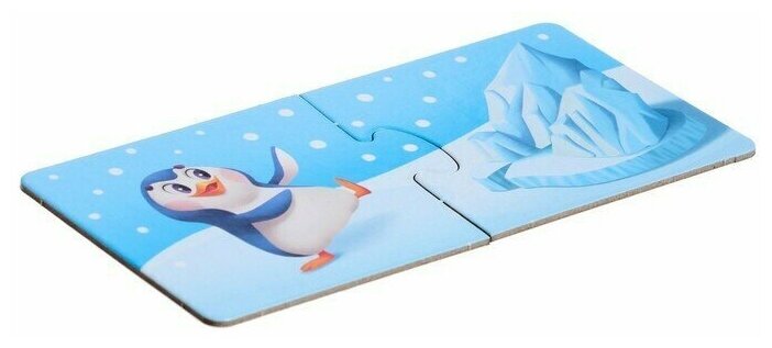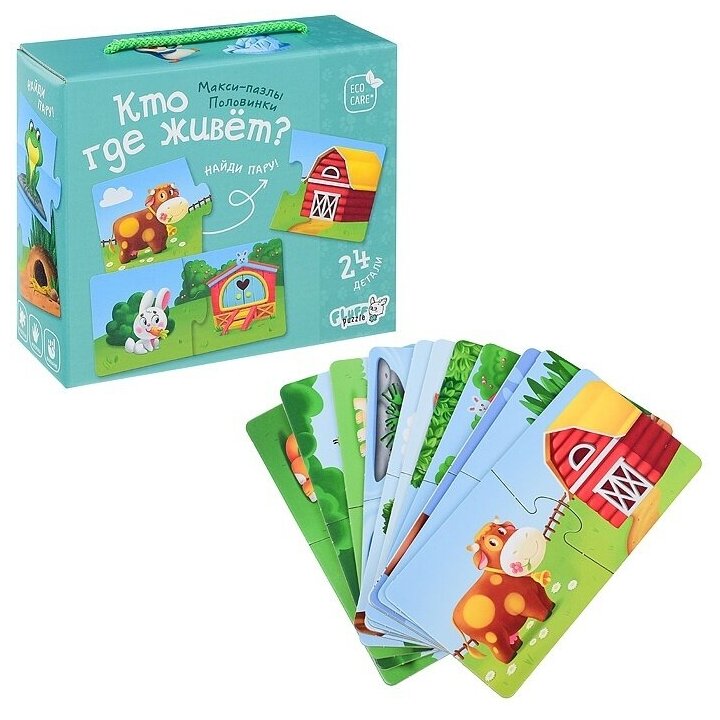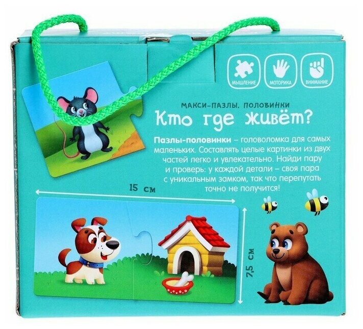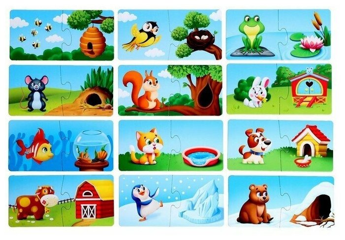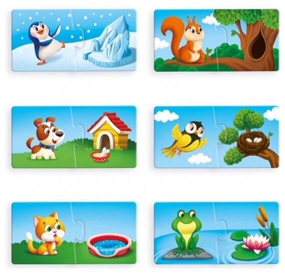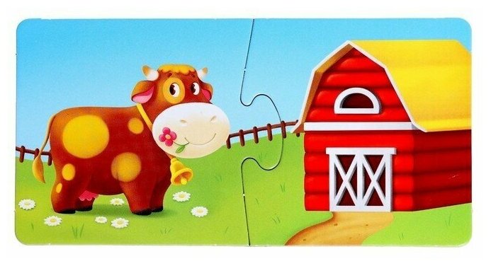 В яркой коробке находится 12 картинок, разделённых на 2 части. Размер одной собранной картинки – 15см*7,5 см. Составлять пазлы из двух половинок легко и увлекательно.
