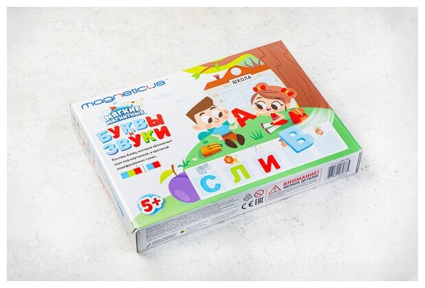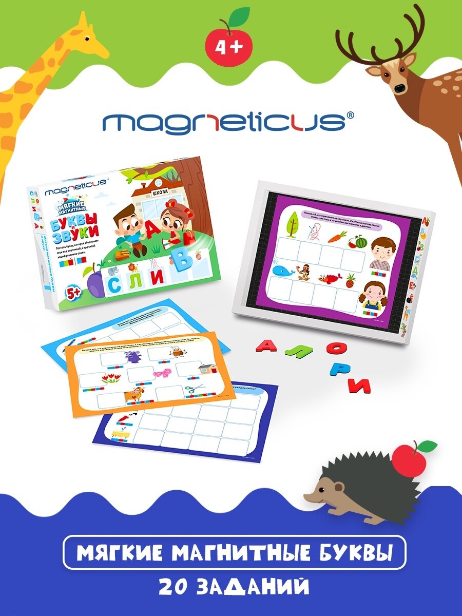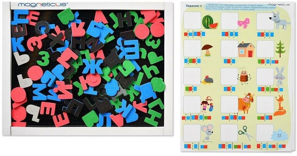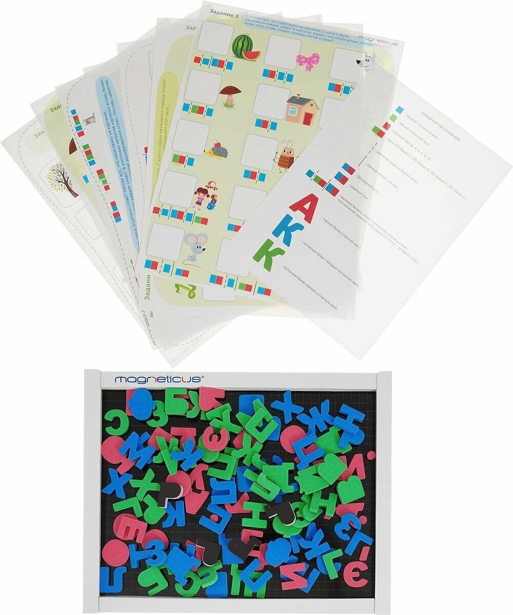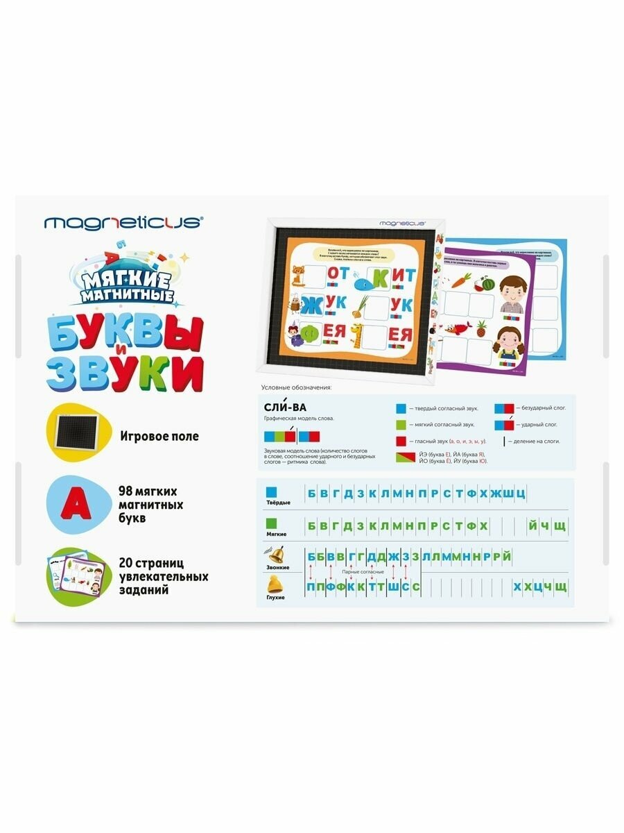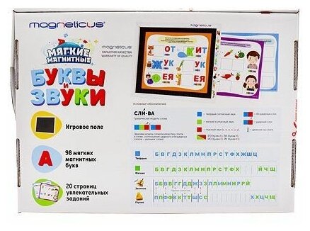 В набор входит: игровое поле, 20 страниц увлекательных заданий, 98 мягких магнитных букв.