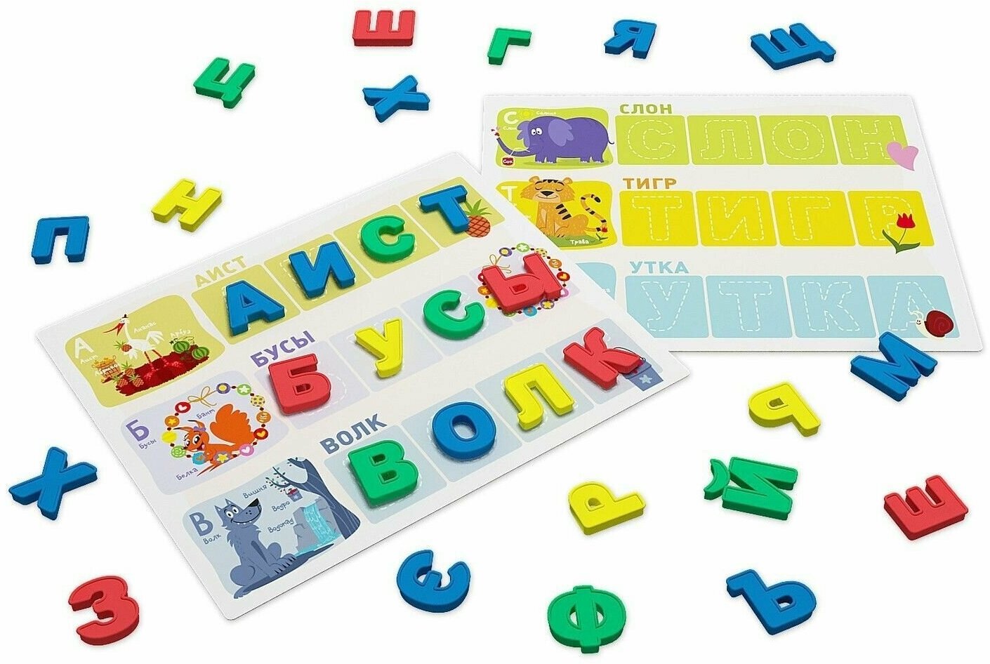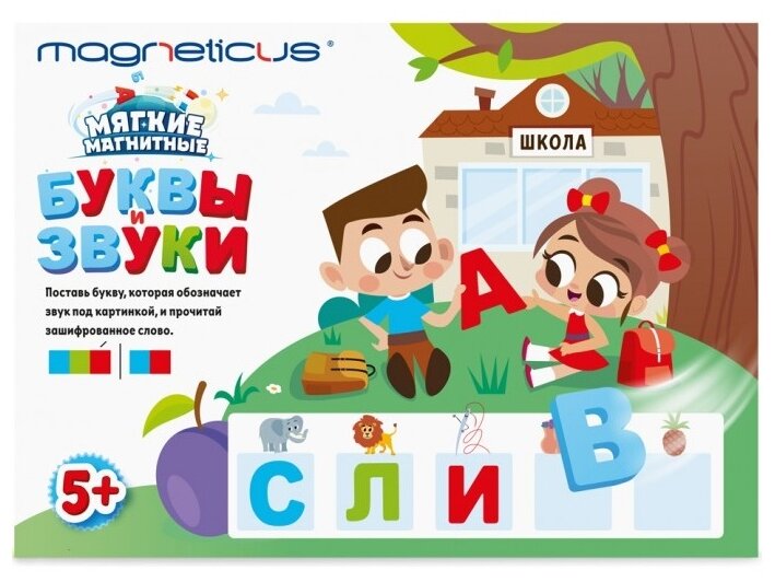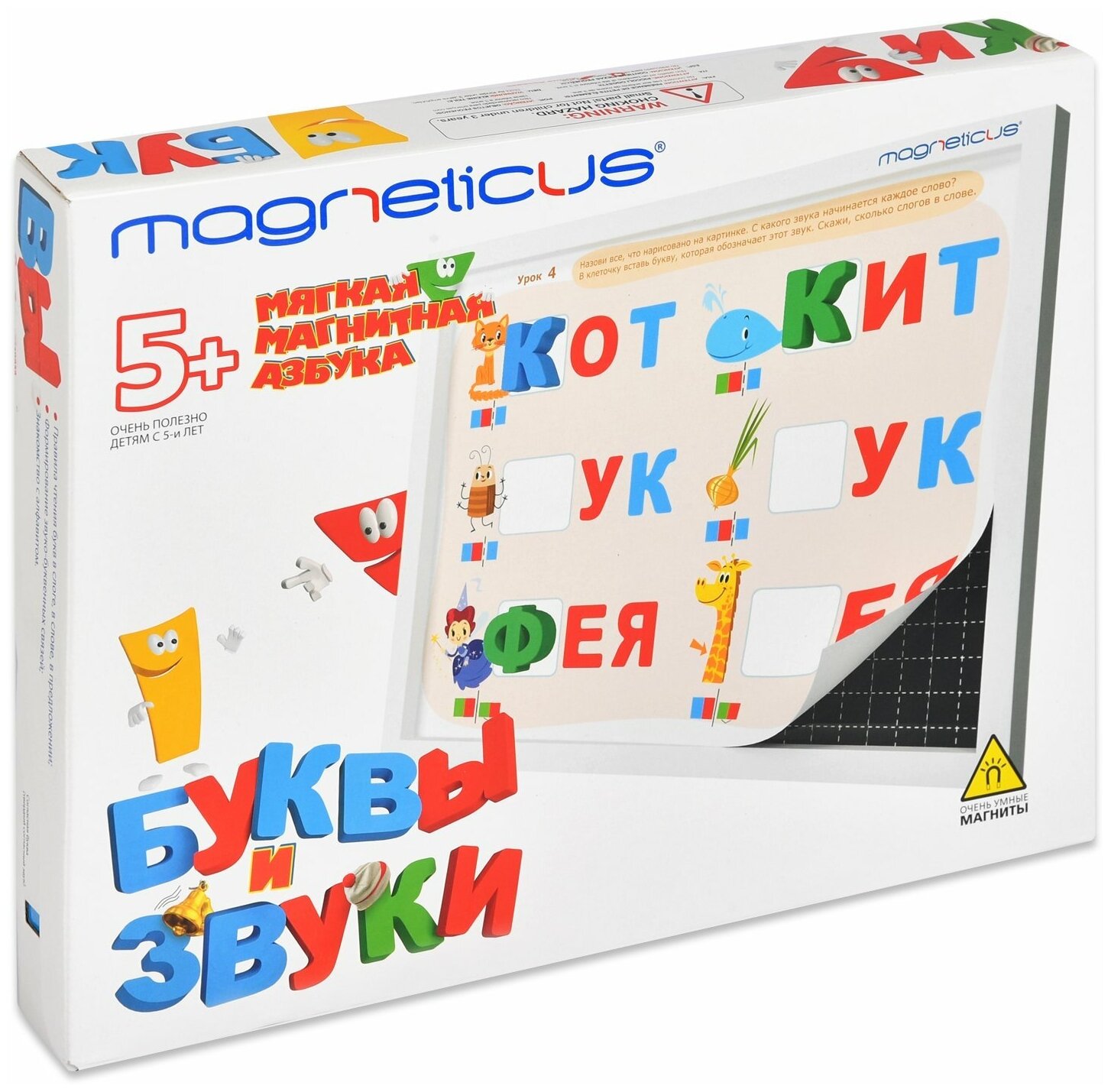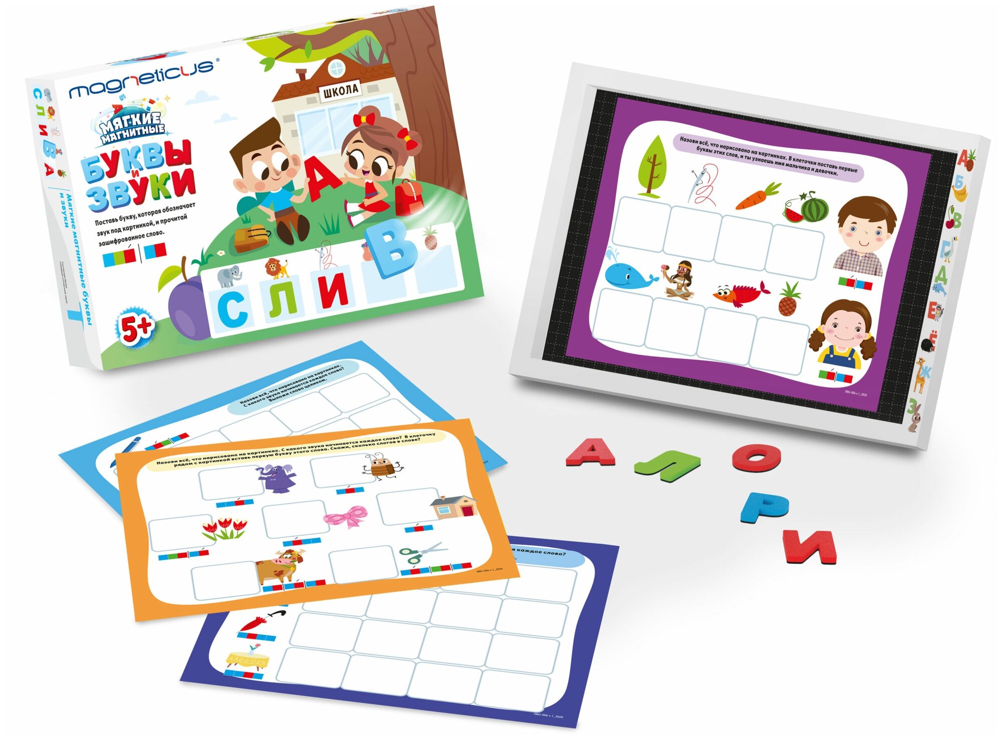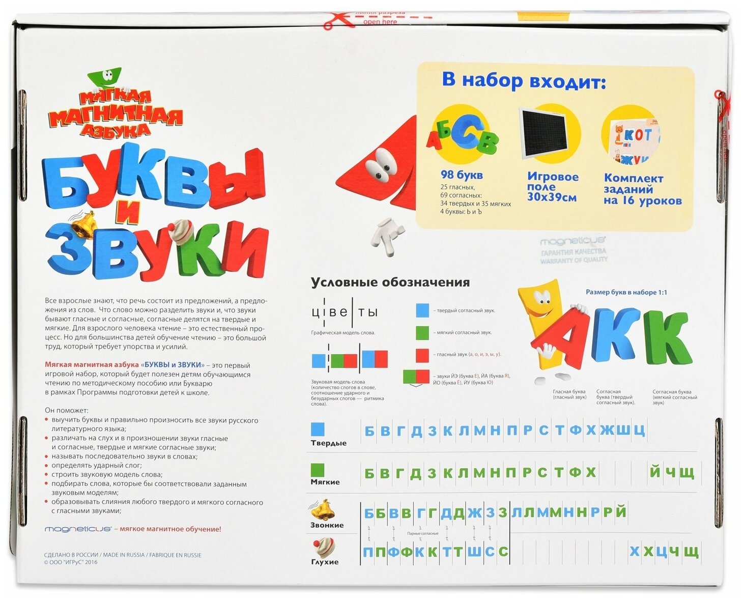 В набор входит: игровое поле, 20 страниц увлекательных заданий, 98 мягких магнитных букв.