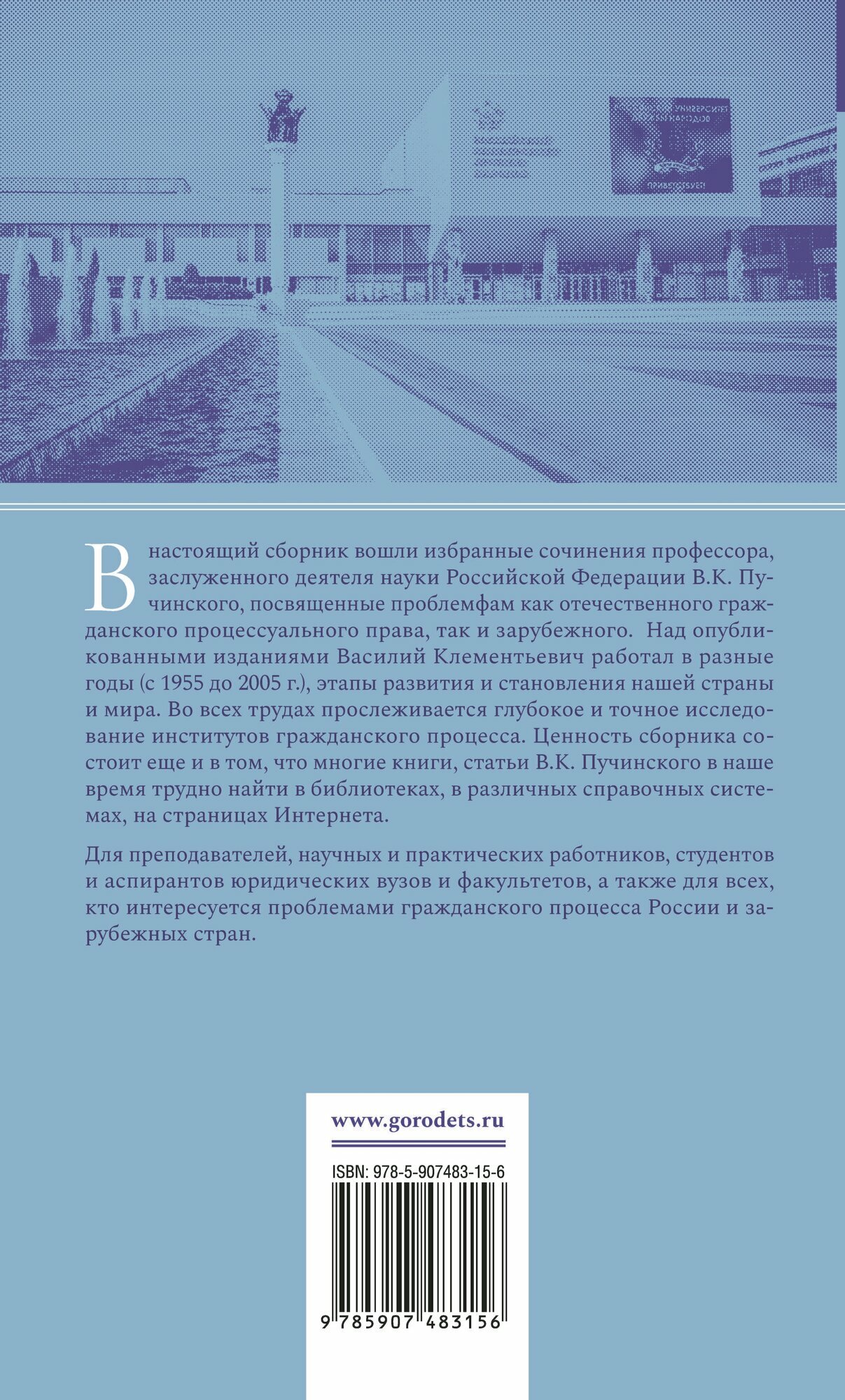 В настоящий сборник вошли избранные сочинения профессора, заслуженного деятеля науки Российской Федерации В.К. Пучинского, посвященные проблемам как отечественного гражданского процессуального права, так и зарубежного.