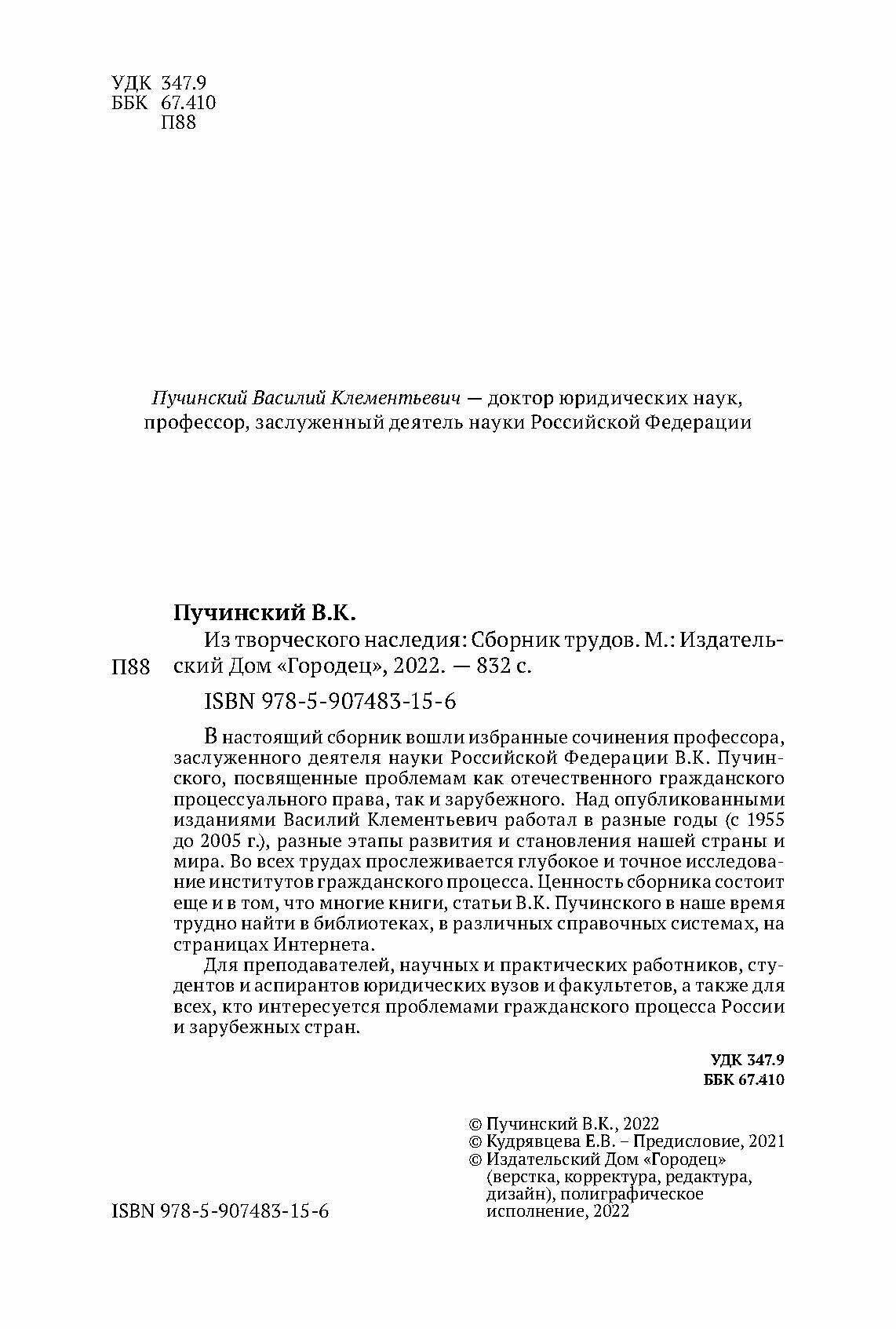 Над опубликованными изданиями Василий Клементьевич работал в разные годы (с 1955 до 2005 г.), разные этапы развития и становления нашей страны и мира. Во всех трудах прослеживается глубокое и точное исследование институтов гражданского процесса. Ценность сборника состоит еще и в том, что многие книги, статьи В.К. Пучинского в наше время трудно найти в библиотеках, в различных справочных системах, на страницах Интернета.