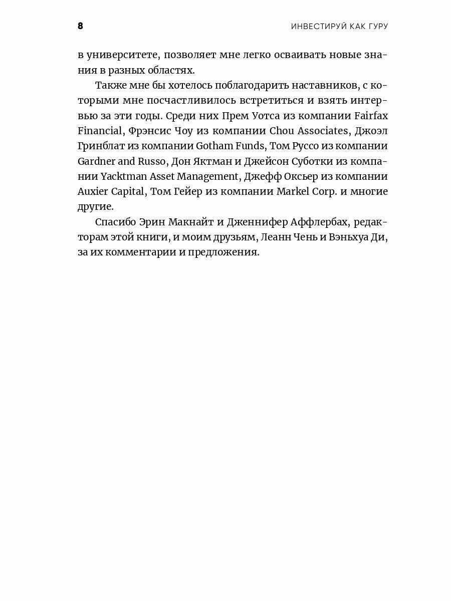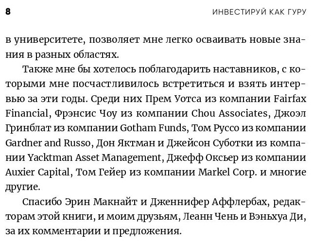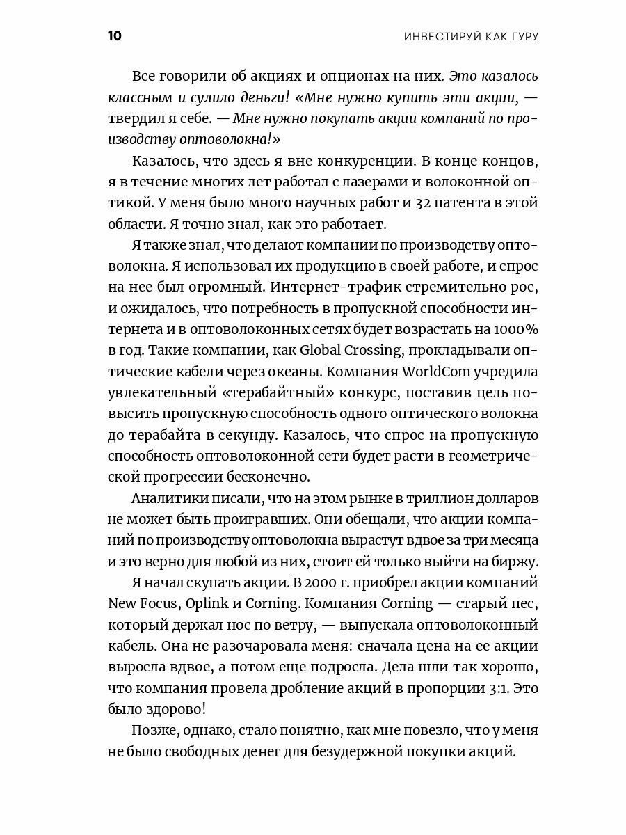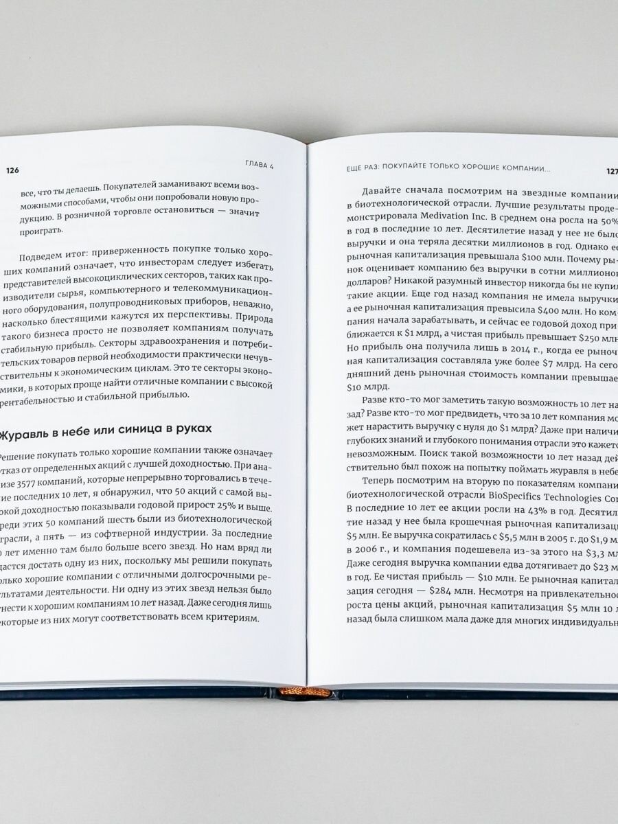 Данная книга написана очень хорошо и понятным языком, для людей которые только начинают инвестировать будет очень много полезной информации. Данную книгу брал себе и могу поставить твёрдую 10 за материал который написан в ней: автор рассказывает о своих ошибках, взлетах и падениях, и так же приводит пример знаменитых инвесторов и их тактик инвестирования. Ни капли не пожалел что купил, сделал много закладок для себя и черпнул знаний.