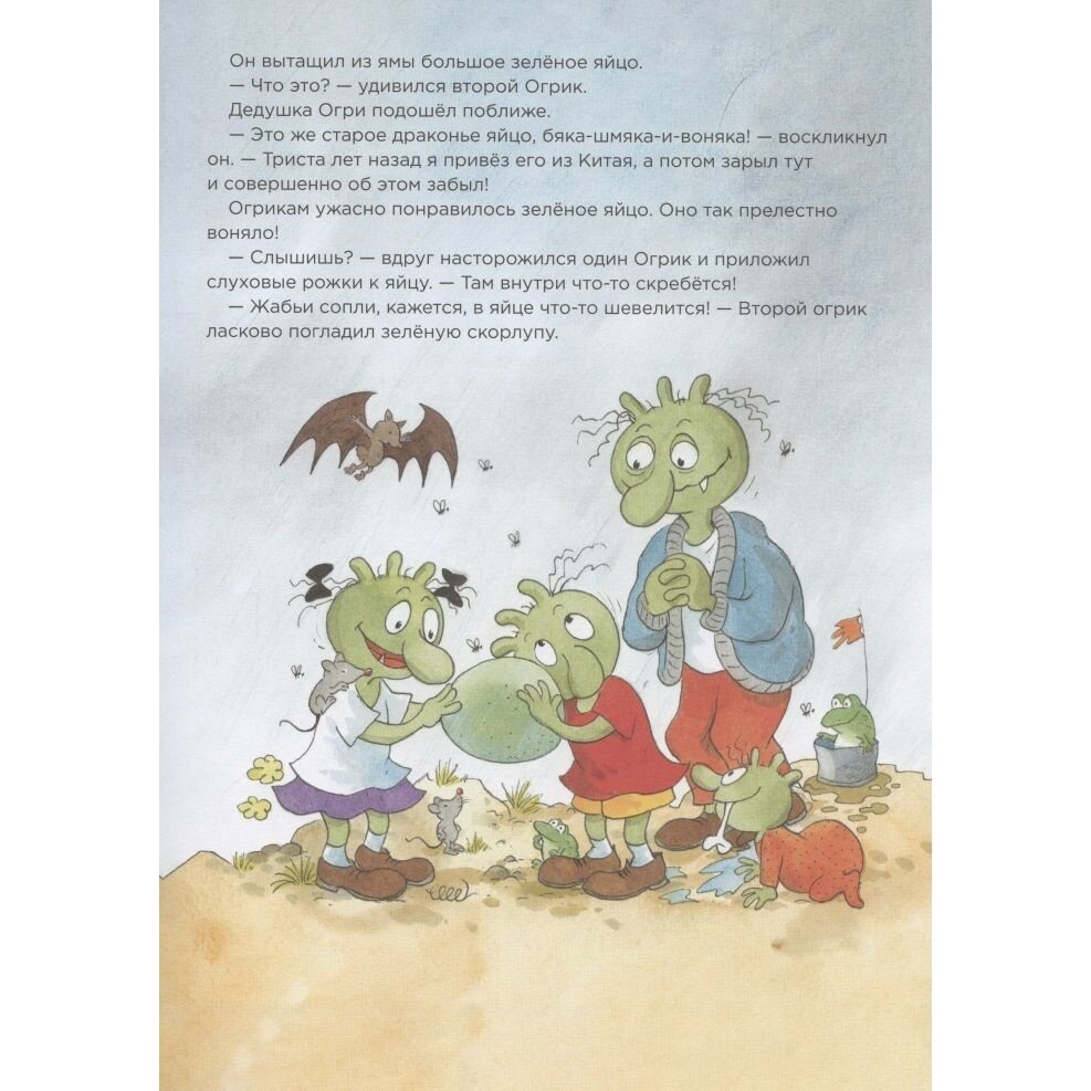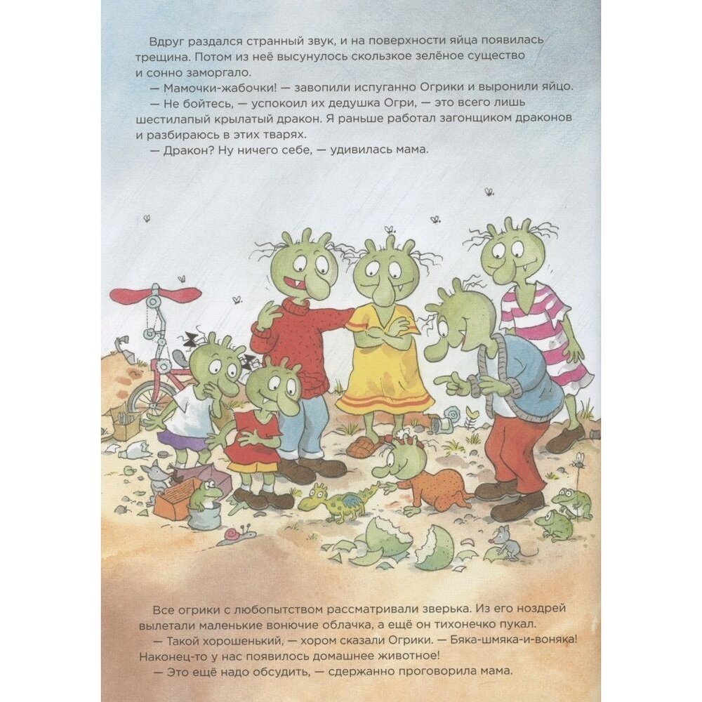 Оказывается, любимец Огриков дракон Огнепых появился из яйца, которое дедушка Огри привёз когда-то давно из Китая. Он сразу полюбился всему семейству, но однажды загрустил и перестал пыхать огнём. Огрики сразу полетели в Грязьбург за помощью. Но ни ветеринар, ни библиотекарь, ни даже автомеханик не смогли им помочь… Смогут ли дети Огрики вылечить дракона и доказать родителям, что они готовы заботиться о собственном домашнем питомце?