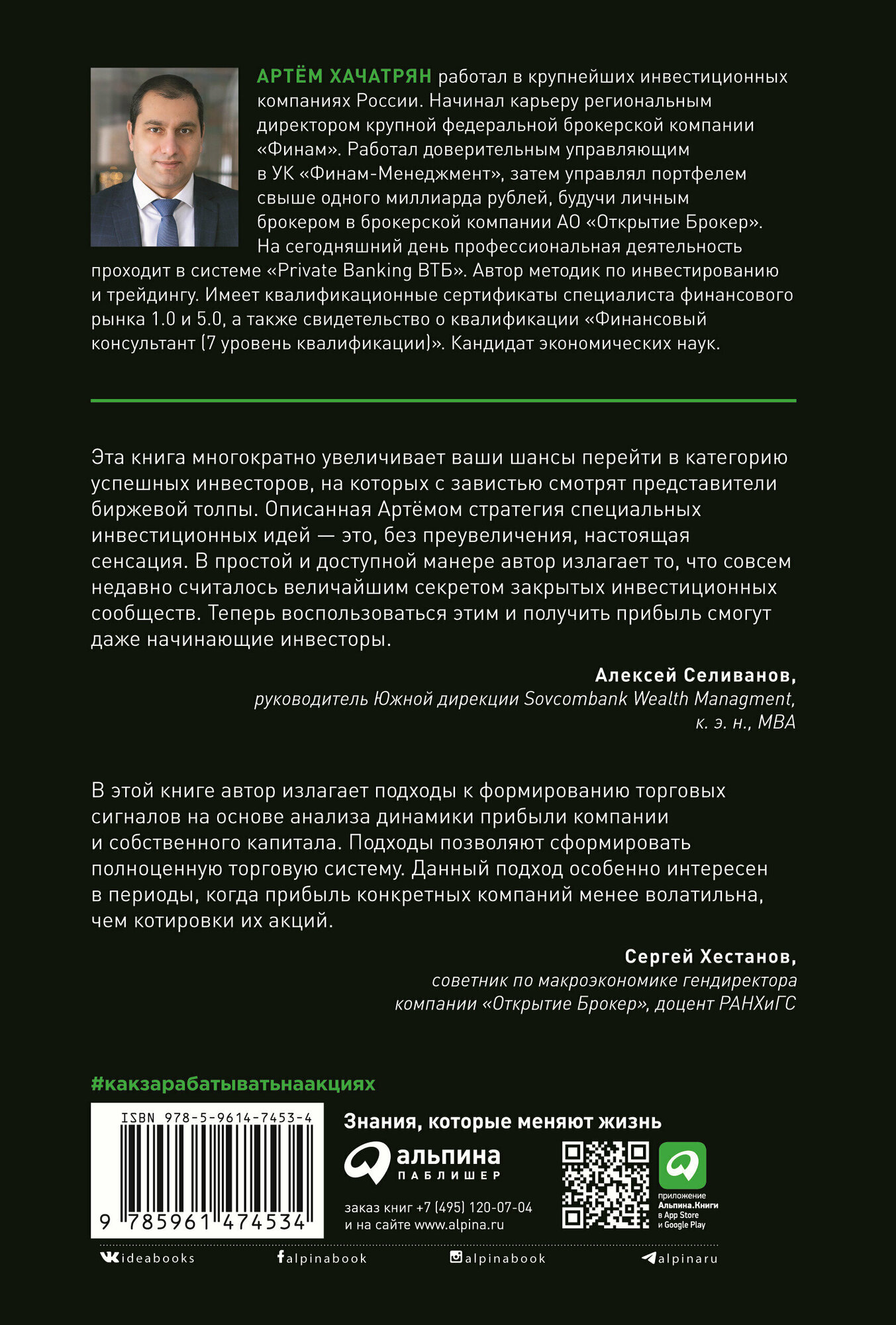 Задача инвестора заключается в том, чтобы распознать действительно прибыльные компании и избежать вложений в убыточный бизнес. Для этого нужно уметь грамотно анализировать финансовые показатели компаний. Эта книга написана для тех инвесторов, которые при минимальном использовании финансового анализа хотели бы получать максимум прибыли от своих вложений в акции. Артём Хачатрян рассказывает о методах инвестиций, которые были опробованы на практике как им самим, так и многими его учениками и клиентами. Автор приводит простые алгоритмы расчетов, которые, не требуя глубоких математических знаний, позволяют определить обоснованные ценовые уровни для покупки акций, а также прогнозную цену для их выгодной продажи в будущем. Эти методы позволяют на протяжении нескольких лет создать свой капитал, стать финансово независимым человеком.