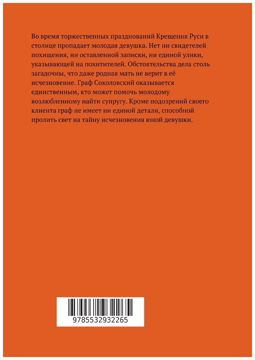 Во время торжественных празднований Крещения Руси в столице пропадает молодая девушка. Нет ни свидетелей похищения, ни оставленной записки, ни единой улики, указывающей на похитителей. Обстоятельства дела столь загадочны, что даже родная мать не верит в её исчезновение. Граф Соколовский оказывается единственным, кто может помочь молодому возлюбленному найти супругу. Кроме подозрений своего клиента граф не имеет ни единой детали, способной пролить свет на тайну исчезновения юной девушки.