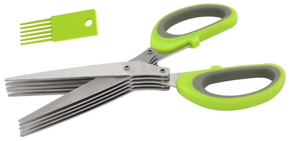 Как быстро нарезать лук, укроп, петрушку и другую зелень? Используйте специальные кухонные ножницы для зелени. Приспособление имеет 3 лезвия, что делает нарезку гораздо быстрее и эффективнее. В комплекте есть ножницы, чехол и кисточка для очистки лезвий от застрявших кусочков. Используя эти ножницы, вы с легкостью нашинкуете зелень в горячие блюда, супы и для заготовок. После использования промойте с моющими средствами. Инструмент удобно хранить на крючке или в ящике стола. Специальный чехольчик сделает хранение изделия безопасным.