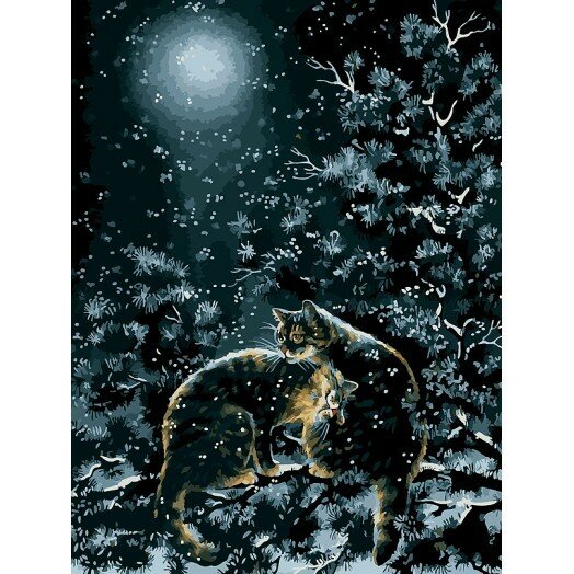 Нашего героя ждет свидание с подружкой в зимнем саду.Добавьте блестящий акцент в свою картину! В комплект к набору идет дополнительная серебряная краска, после завершения работы по своему выбору подчеркните детали картины тонкими серебристыми штрихами. О художнике Ирине Гармашовой Больше информации о наборах;Живопись по номерам на холсте Черные кошки;