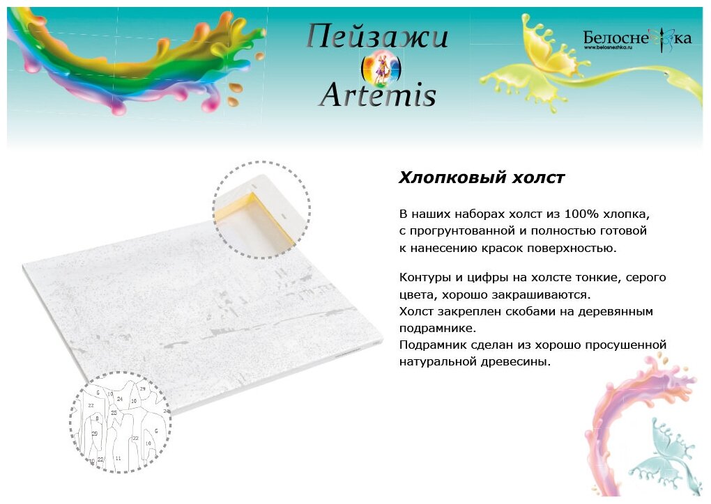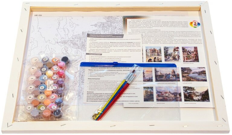 | Комплектация | Холст на подрамнике с пронумерованной схемой, Контрольный лист, Набор акриловых красок, Кисти – 4 шт., Крепление для готовой картины, Пакет с zip-застежкой 23 х 17,5 см, Листовка о художнике |