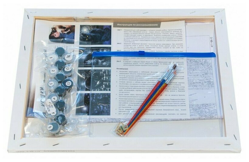 | Комплектация | Холст на подрамнике с пронумерованной схемой, Контрольный лист, Набор акриловых красок, Кисти – 4 шт., Крепление для готовой картины, Пакет с zip-застежкой 23 х 17,5 см |