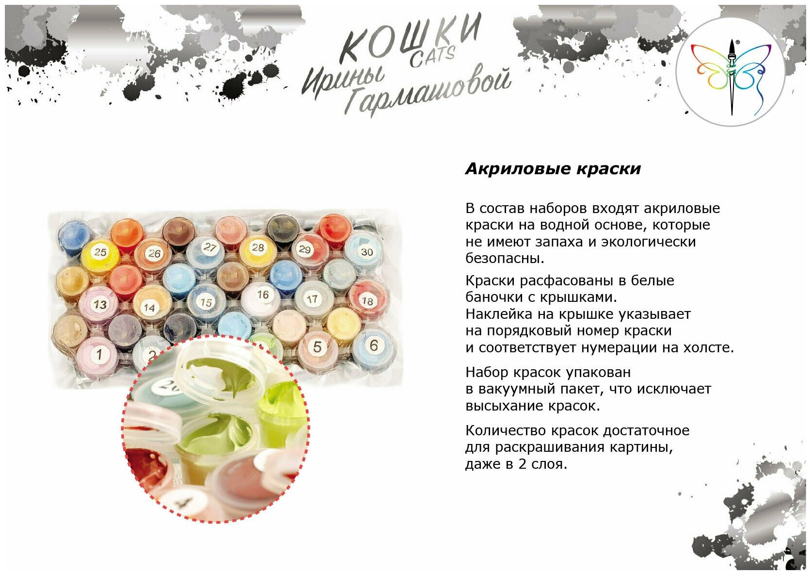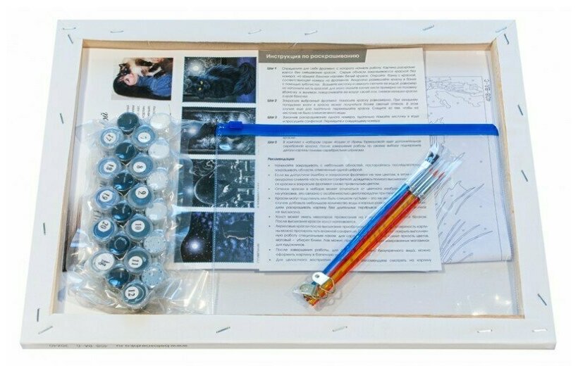 | Комплектация | Холст на подрамнике с пронумерованной схемой, Контрольный лист, Набор акриловых красок, Кисти – 4 шт., Крепление для готовой картины, Пакет с zip-застежкой 23 х 17,5 см |
