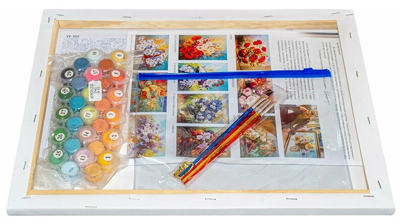 | Комплектация | Холст на подрамнике с пронумерованной схемой, Контрольный лист, Набор акриловых красок, Кисти – 4 шт., Крепление для готовой картины, Пакет с zip-застежкой 23 х 17,5 см., Листовка о художнике |