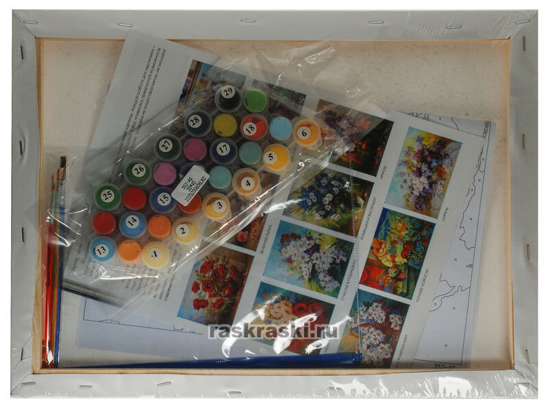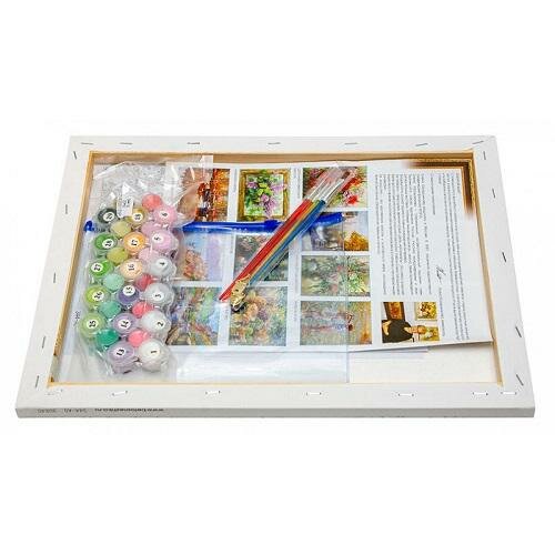 | Комплектация | Холст на подрамнике, Акриловые краски, 4 кисти, Крепеж для подвешивания картины, Контрольный лист, Пакет А-5 с замком-застежкой для хранения красок. |