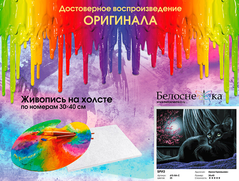 Набор для творчества Живопись на холсте: 415-BA-C Бриз Серия наборов для творчества Кошки от Ирины Гармашовой в стильной черной упаковке! Любите кошек, восхищайтесь кошками, рисуйте кошек вместе с Белоснежкой! Представьте себе один день из жизни нашего пушистого друга и создайте маленькую историю на холсте.У нашего героя настало время заняться любимым делом – предаться размышлениям сидя на мягкой кровати у открытого окна.