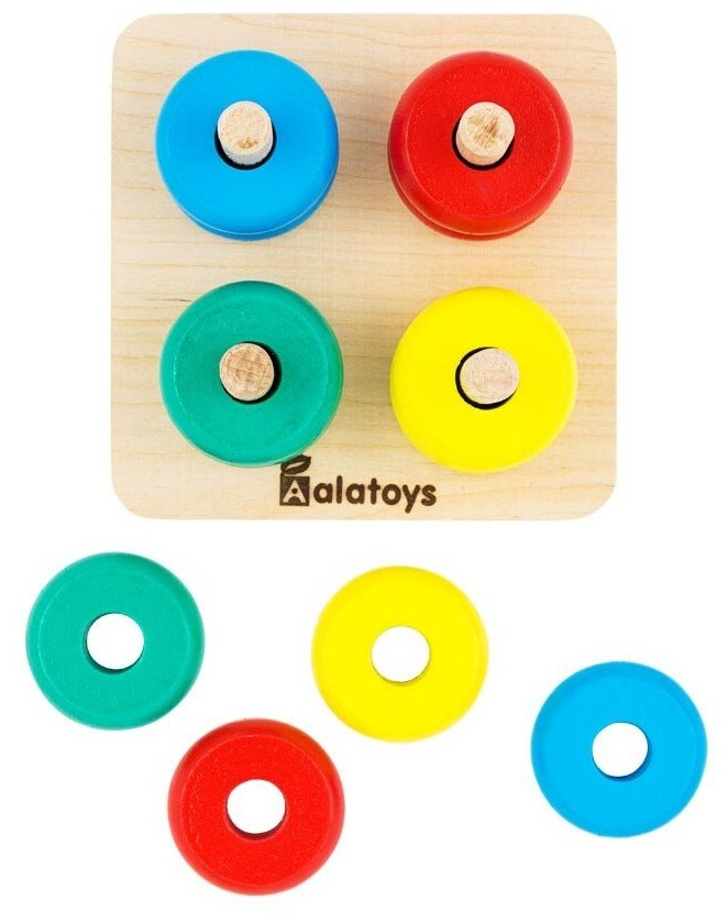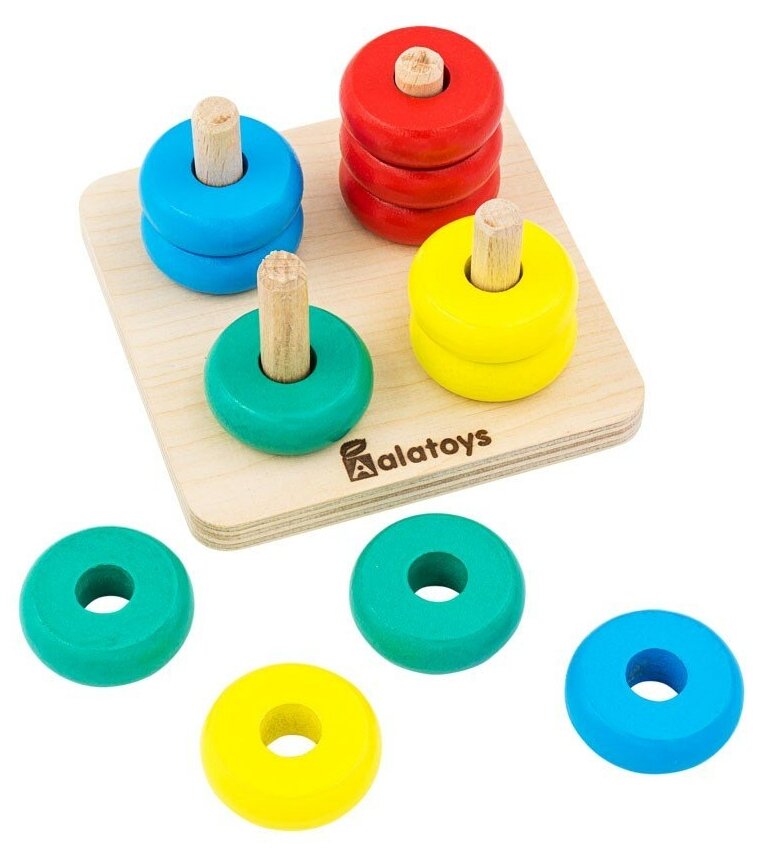 Пирамидка Счёты - развивающая игрушка от Алатойс, представляющая собой деревянную основу с 4 шкантами и 12 колец для нанизывания. Основная задача: нанизать нужное кольца на штыри в соответствии с оттенками основного цвета.