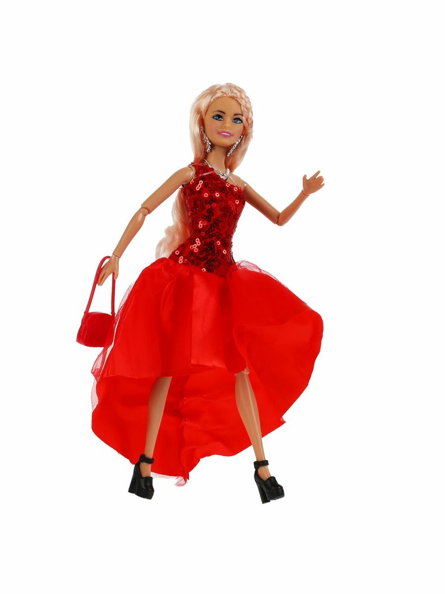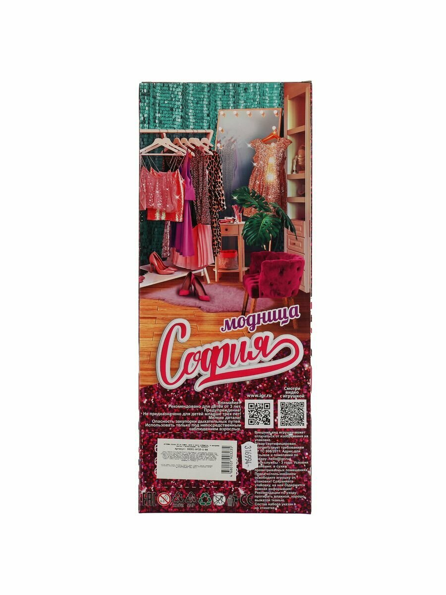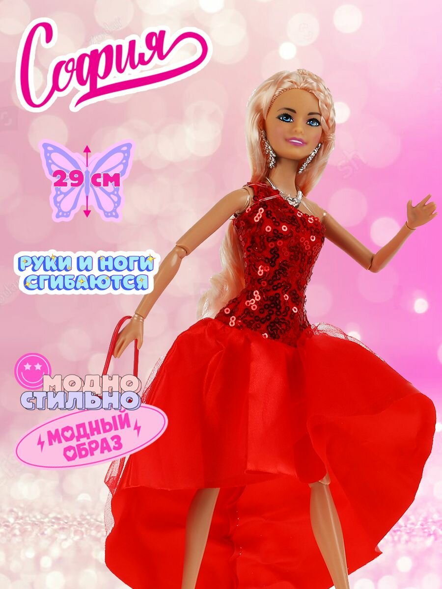 Модница-София одета в вечернее платье с верхом из сверкающих пайеток, пышной юбкой и небольшим шлейфом, образ дополнен изящными серьгами, элегантным колье и сумочкой. С такой модной куклой девочке будет интересно и весело играть: благодаря тому, что руки и ноги куклы подвижны, им можно придать любое положение. У Софии длинные красивые волосы, которые хозяйка куклы сможет заплетать в разные причёски. Детально проработанный дизайн игрушки вдохновит девочку на новые игровые сюжеты.