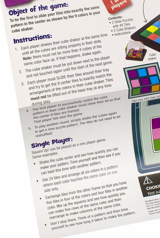 Игра Square up! будет интересна как для детей, так и для взрослых и станет хорошим развлечением на вечер. Цель игры: как можно быстрее изобразить сочетание цветов на своем игровом поле, передвигая квадратики в горизонтальном и вертикальном направлении. Квадратики нельзя поднимать, их можно только передвигать!
