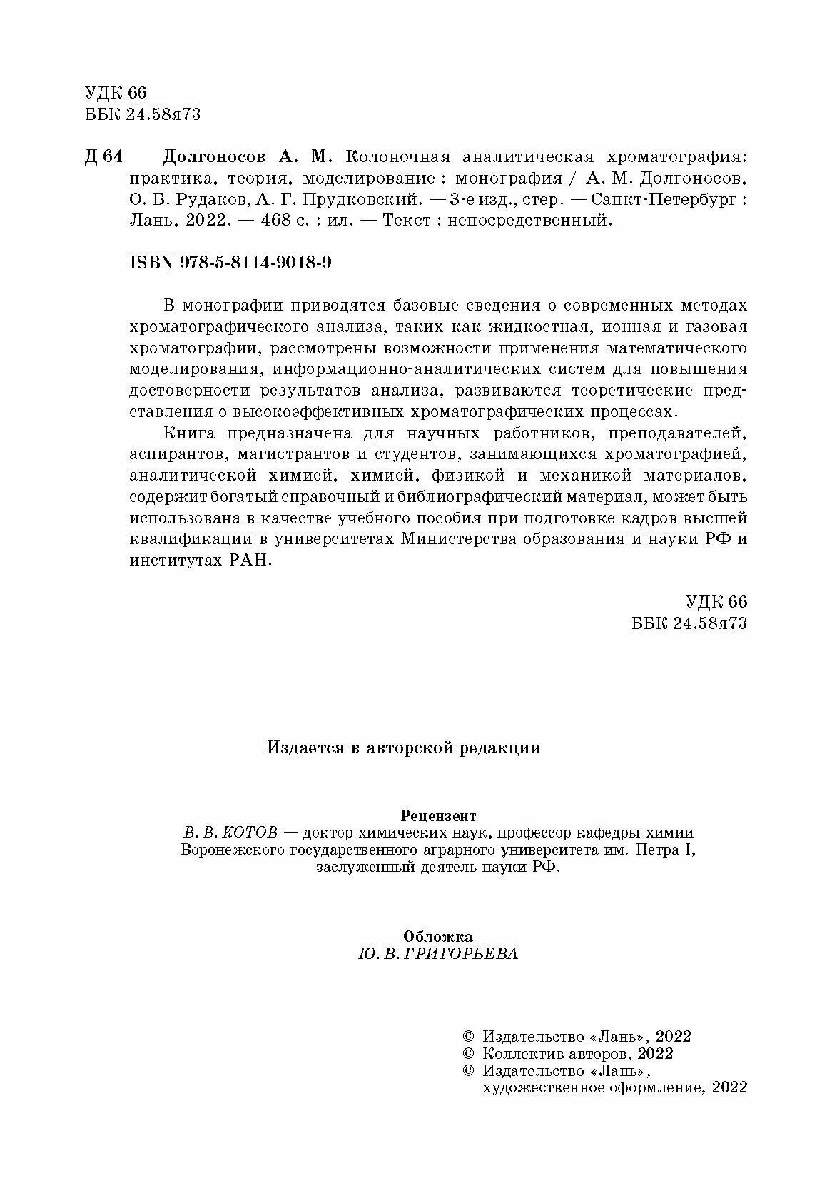 Колоночная аналитическая хроматография практика теория моделирование (Рудаков Олег Борисович, Долгоносов Анатолий Михайлович, Прудковский Андрей Гаральдович); Лань, 2022