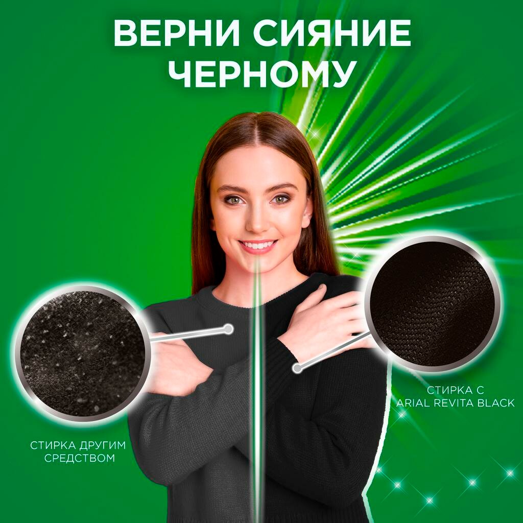 Жидкий порошок для стирки Ariel + Revitablack обеспечивает исключительное очищение и восстанавливает черные и темные цвета, даже при стирке в холодной воде. При наличии трудновыводимых пятен обработайте их сначала гелем для стирки Ariel, а затем загрузите одежду в стиральную машину. Для наилучших результатов добавьте мерный колпачок с гелем для стирки в барабан стиральной машины. Ariel + Revitablack также доступен в форме капсул. - Гель для стирки Ariel + Revitablack восстанавливает яркость черных и темных цветов благодаря технологии восстановления волокон - Исключительное очищение, даже при стирке в холодной воде - Обеспечивает дополнительную защиту вашей одежды - Обеспечивает безупречные результаты даже в неблагоприятных условиях - 100% перерабатываемый флакон