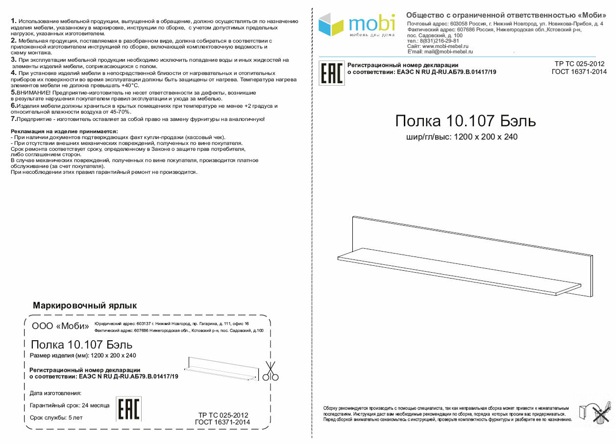 | Наименование модели (Модель) | Бэль 10.107 |