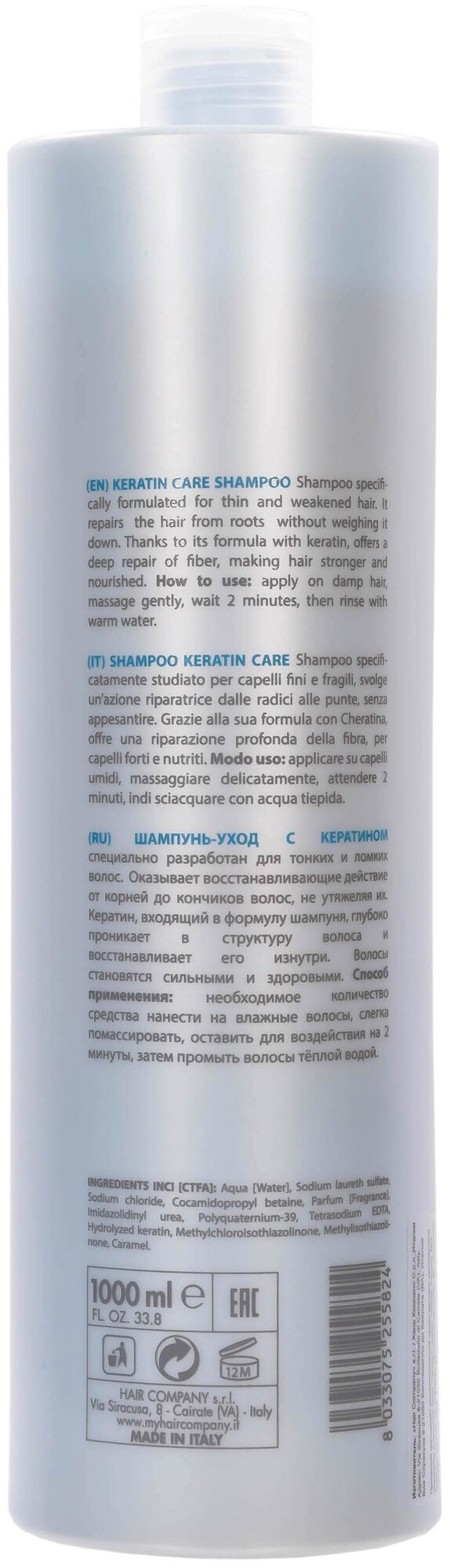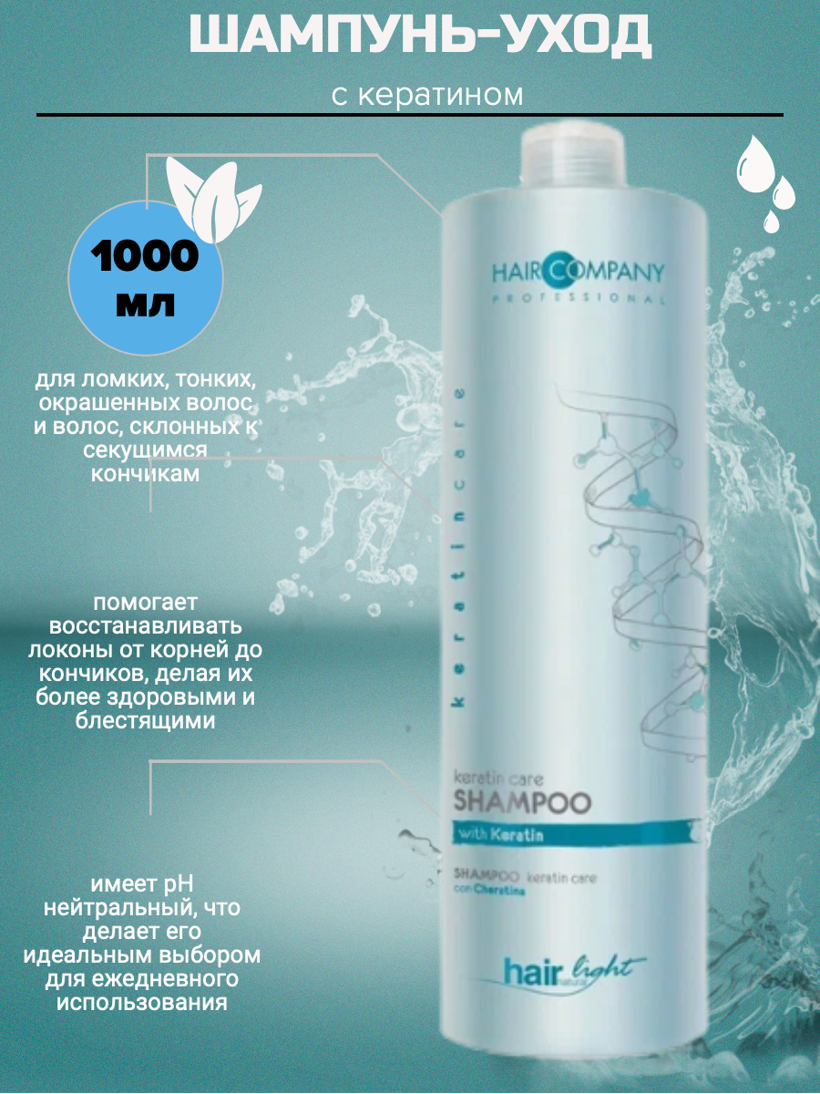 Hair Company HAIR LIGHT KERATIN CARE Шампунь уход с кератином специально разработан для тонких и ломких волос. Оказывает восстанавливающее действие от корней до кончиков волос, не утяжеляя их. Кератин, входящий в формулу шампуня, глубоко проникает в структуру волоса и восстанавливает его изнутри. Волосы становятся сильными и здоровыми.Продукция линии keratincare специально разработана для укрепления тонких, ломких и повреждённых волос. Концентрация Кератина проникает глубоко внутрь каждого волоса, в результате чего происходит его полное восстановление от корней до самых кончиков. Таким образом, волосам возвращается их естественное состояние и блеск. Глубокое восстановление тонких и ломких волос волосы восстановленные, более сильные и живые.