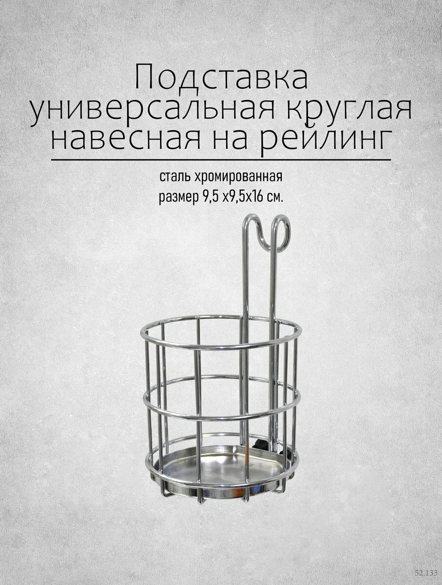 Для хранения и сушки столовых приборов подойдет универсальная круглая подставка. Изделие навешивается на рейлинг, но может также устанавливаться на горизонтальную поверхность. Подставка подойдет для вилок, ложек, лопаток, кухонных аксессуаров, бутылок с моющими средствами и т.д. Приспособление изготовлено из стальной хромированной проволоки, что обеспечивает стильный блеск и долговечность.