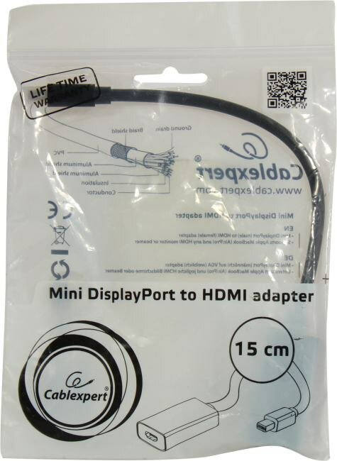Интерфейсный кабель-адаптер Gembird Cablexpert miniDisplayPort - HDMI Black предназначен для конвертации mini DisplayPort (вилка) в HDMI (розетка) и позволяет подключать устройства c интерфейсом HDMI к мини-DisplayPort видеовыходу аппаратуры. Видеоразрешение, которое поддерживается при подключении через данный кабель, составляет 1080p и 1920×1200 пикс. при частоте обновления экрана 60 Гц. Поддерживает ноутбуки Apple. Не требует питания и программного обеспечения. Кабель имеет длину 15 см.