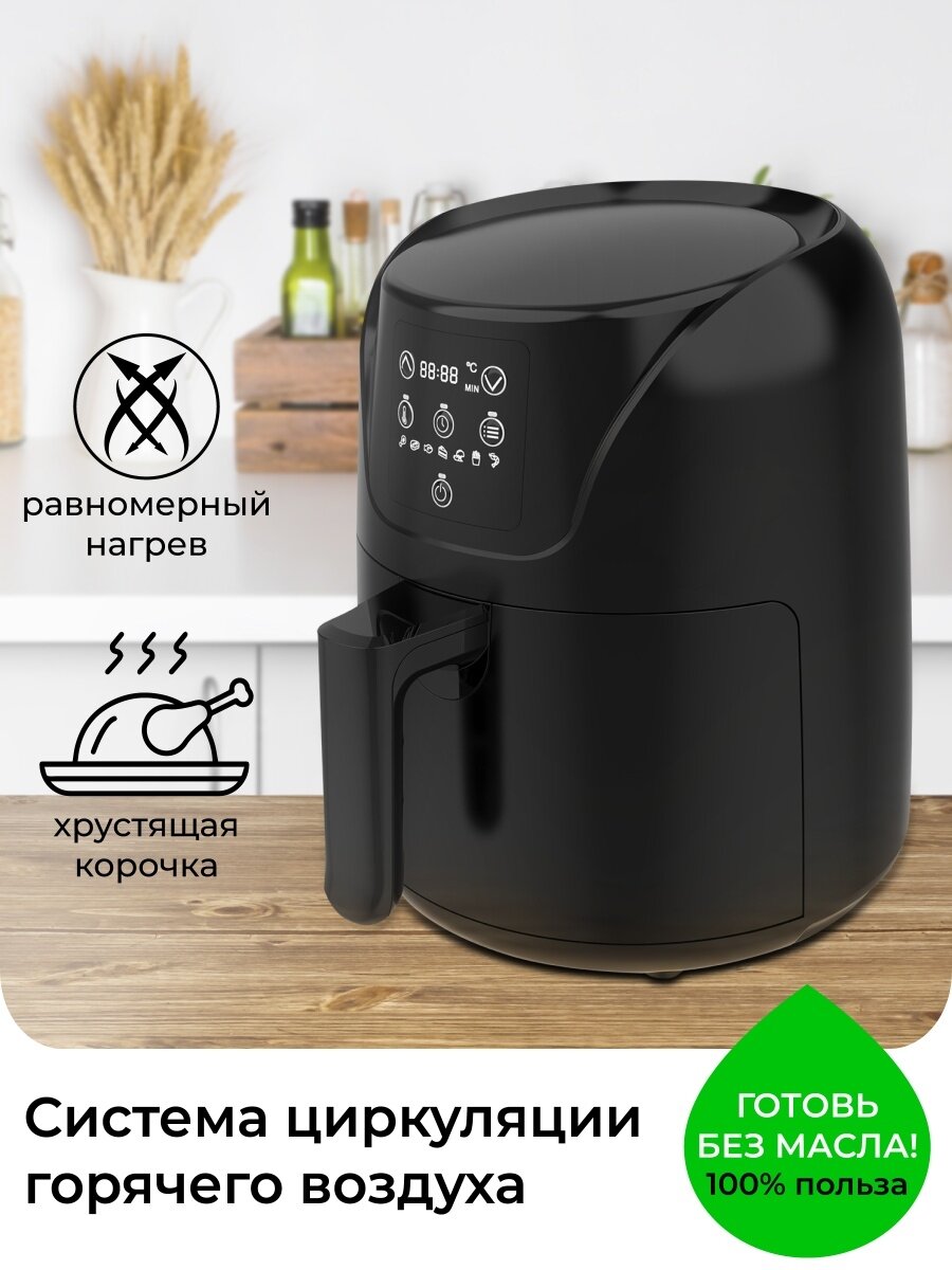 режимами готовки. Доступен контроль за объемом масла: можно готовить без него или с минимальным количеством. Температура регулируется в диапазоне от 80 до 200 градусов по Цельсию. Удобный таймер сэкономит время и позволит спокойно заниматься другими делами, пока идет процесс готовки.