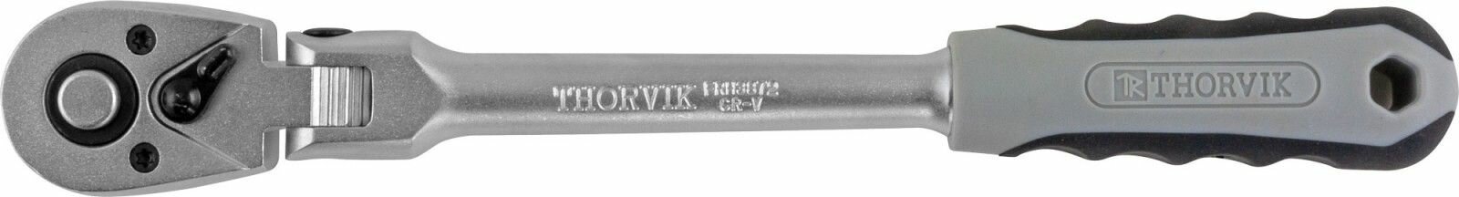 Трещоточная рукоятка с шарниром Thorvik FRH3872, 3/8 DR, 72 зубца, 240 мм 53374 предназначена для работы с крепежом при ремонтных и строительно-монтажных работах.Изготовлена из качественной хром-ванадиевой стали, что обеспечивает стойкость к износу, прочность и долгий срок службы. Никель-хромовое покрытие защищает инструмент от коррозии. Трещотка оснащена флажковым переключателем для изменения направления движения храпового механизма. Шарнир с сегментированной фиксацией позволяет работать ключом под разными углами. Двухкомпонентная бензомаслостойкая рукоятка эргономична и не скользит в руках оператора.