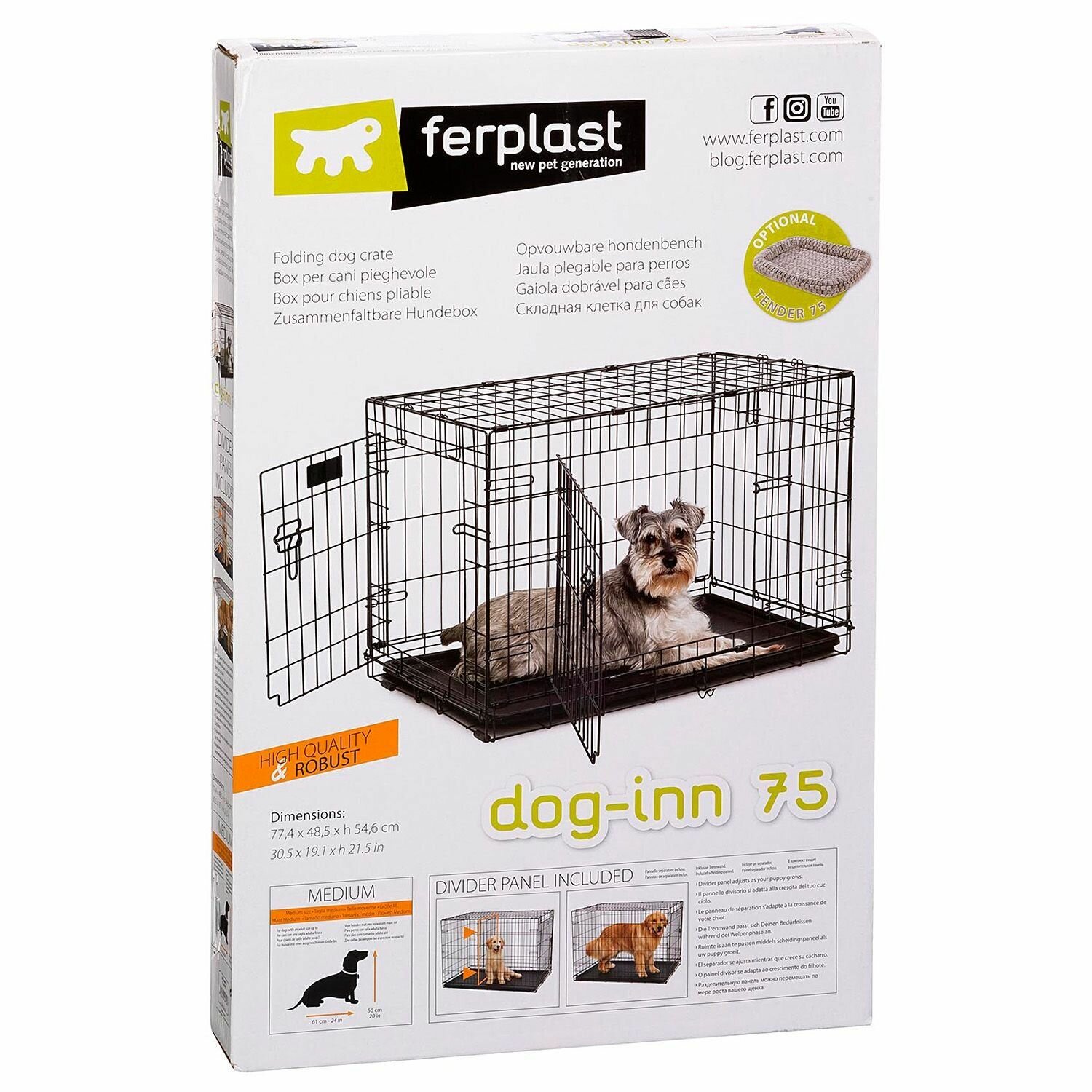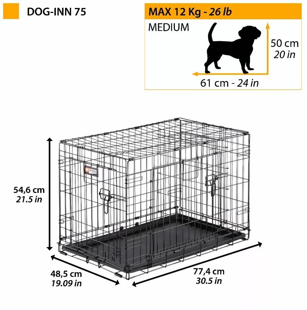 - Dog-Inn 75, размер клетки 77.4 x 48.5 x h 54.6 см, идеальна для собак среднего размера, взрослый вес которых до 12 кг, 50 см в высоту и 61 см в длину