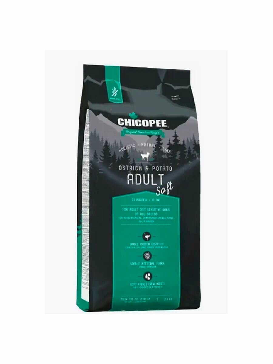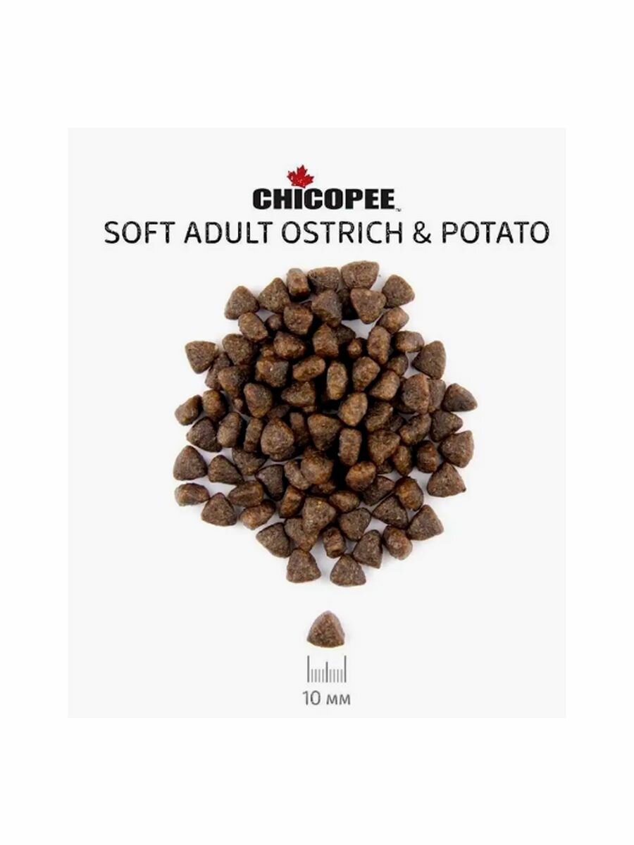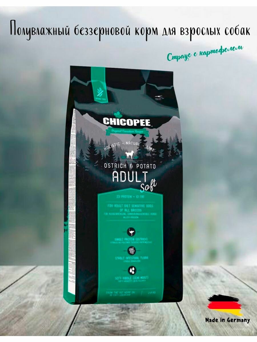 Chicopee HNL Soft Adult Ostrich & Potato – полувлажный беззерновой монобелковый корм для взрослых собак всех пород с мясом страуса и картофелем.Мясо страуса – единственный источник белка животного происхождения – монопротеиновая формула! В качестве легкоусвояемого источника углеводов использовали картофель. Полувлажный рацион – уникальный вкусовой опыт для вашего питомца. Особенно подходит для собак, склонных к проблемам с пищеварением или непереносимостью определенных видов белка, благодаря особой монопротеиновой формуле.Состав:Мясо страуса (высушенное 20%), картофельная мука (высушенный, 20%), животный жир, сладкий картофель, картофельные хлопья, горох (высушенный), гороховый белок, свекловичная пульпа (без сахара), льняное семя (3%), картофельный белок, дрожжи (дегидрированные, 1,5% ), масло лосося (1%), цикорий (высушенный (0,2%), водоросли (высушенные), юкка, крапива (высушенная), листья ежевики (высушенные), тысячелистник, фенхель, тмин, ромашка, омела, корень горечавки, василек.Добавки на 1 кг:Витамин A 12.000 M.E, витамин С 70 мг, витамин D3 1.200 M. E, витамин С 100 мг, витамин E 110 мг, биотин 450 мг.Микроэлементы: Цинк (в форме окиси цинка) 70 мг, медь (в форме сульфата меди, пентагидрат) 10 мг, йод (в форме йодида кальция, безводный) 2 мг, селен 0,2 мг/кг.