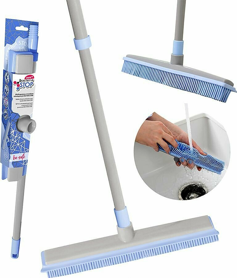 Инновационная резиновая щётка с телескопической рукояткой, позволяющая с лёгкостью убирать любую поверхность. Щётка оснащена антибактериальной щетиной с микрочастицами серебра, которые предотвращают рост бактерий на поверхности изделия и гарантируют безопасное использование. Щётка из серии YORK BACTERIA STOP — это универсальное средство для уборки. Резиновая щетина отлично собирает пыль, волосы и шерсть. С другой стороны щётки имеется резиновый водосгон, который позволит вам с легкостью справиться с водой и пролитыми жидкостями. Щётка подходит для всех типов поверхностей: плитка, кафель, паркет и даже ковровые покрытия. Мягкая щетина не царапает пол. Телескопическая рукоятка позволяет регулировать длину в зависимости от необходимости. Рукоятка покрыта наносеребряным покрытием, поэтому уборка с щёткой YORK BACTERIA STOP не только эффективна, но и безопасна.