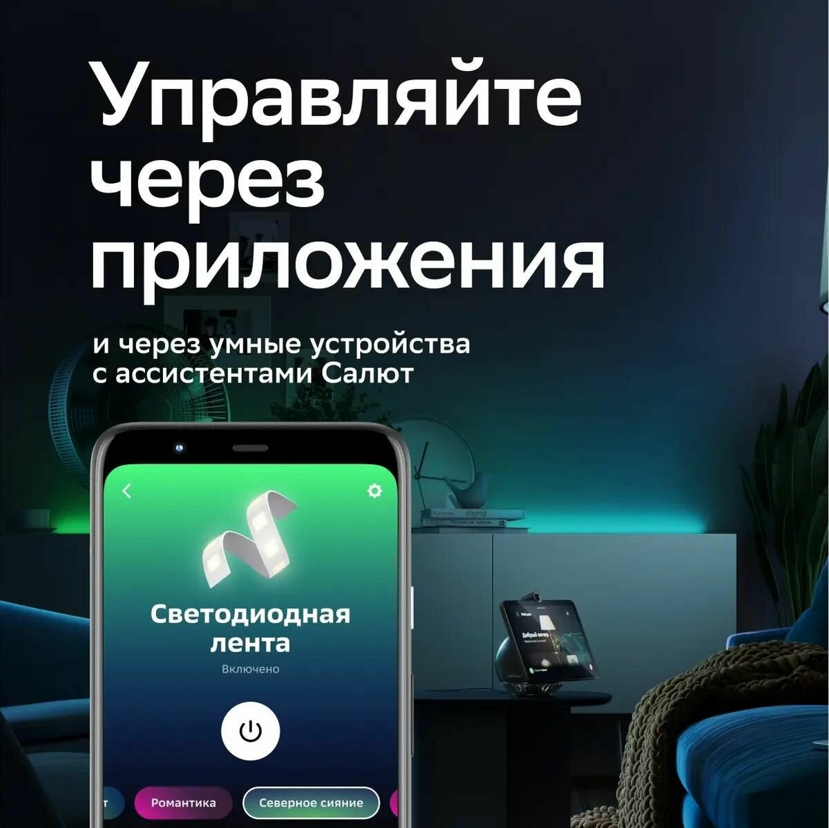 | Светодиодная лента входит в состав умного дома Sber. Ей можно управлять из соседней комнаты, с работы или даже с другого континента голосом или через интерфейс. Для этого понадобится бесплатное приложение Салют или устройство с ассистентами Салют | SberPortal, SberBox или другое. |