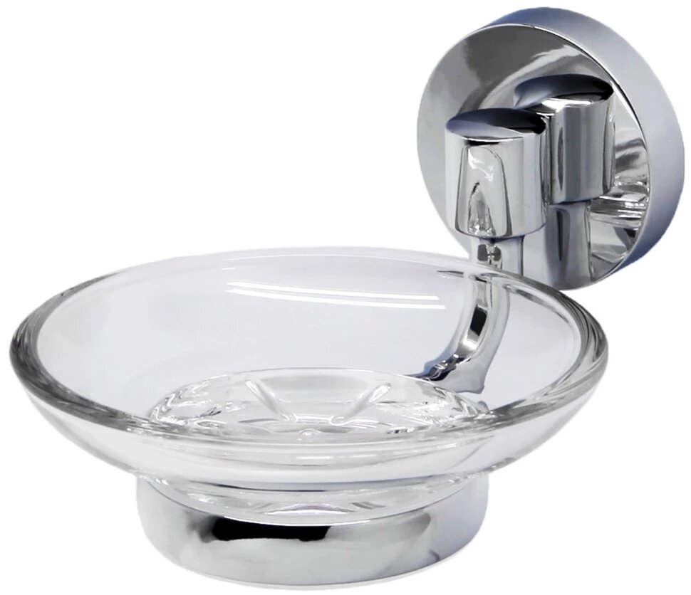 Мыльница настенная. Материалы: металл, хромоникелевое покрытие, уплотнительные пластиковые кольца, прозрачное стекло.