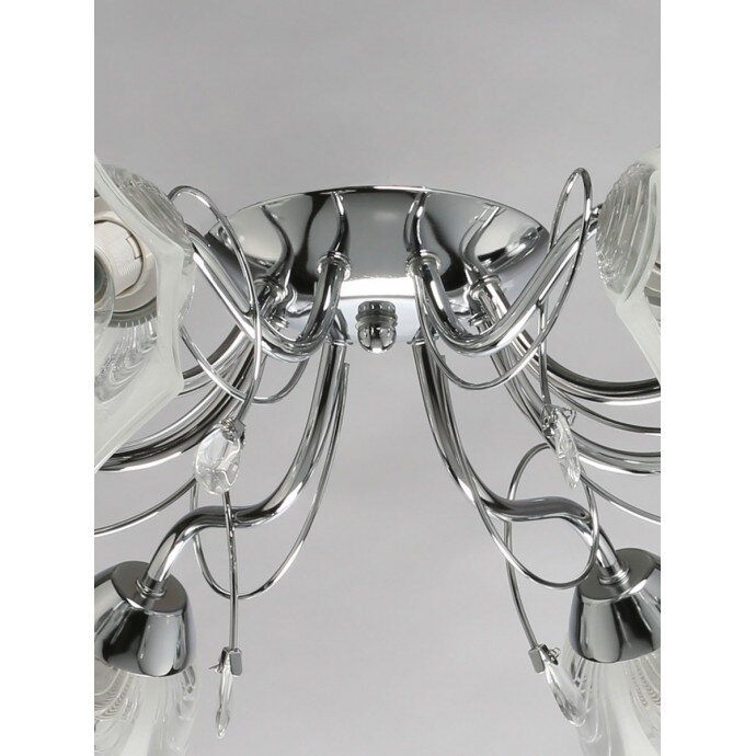Фантазийный дизайн светильника идеален для современных интерьеров. Оригинальный металлический декор цвета хрома добавляет декоративности. Стеклянные рельефные плафоны флористичекой формы частично матированы. Декоративные элементы из хрустального стекла дополняют романтичный образ. Большой диаметр светильника обеспечивает высокие параметры освещения.