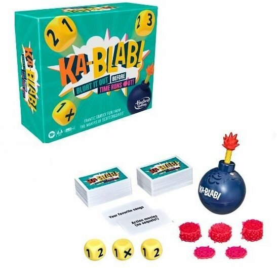 Вашу семью ждет безумное веселье с игрой Ka-Blab, которая превосходит все классические настольные игры! Бросок кубиков определяет, сколько предметов в определенной категории игрок должен назвать, но ему лучше поторопиться! Если прозвучит случайный таймер, ход закончится, и игрок должен будет передать свой жетон с очками. Побеждает последний игрок, у которого остается один или несколько жетонов очков. В динамичной игре от создателей Scattergories представлены более 200 карточек категорий для множества сюрпризов и испытаний. Напряжение и азарт во время игры в Ка-Блаб оценит вся семья!