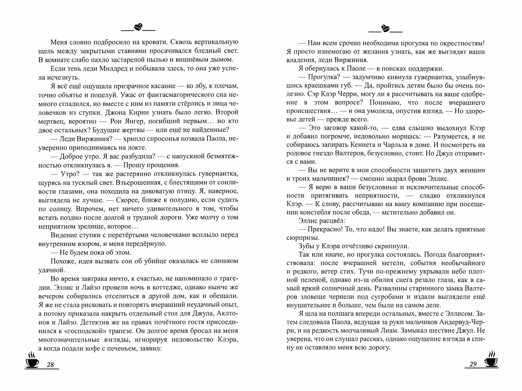 Долгожданное продолжение кофейных историй Софьи Ролдугиной порадовало. Стиль автора, метафоричность и изящество языка, аллюзии, стилизация под викторианскую эпоху - все это на высоте. Хорошо продуманный сюжет, интересная композиция. Леди Виржиния, ее дядюшка Клэр, Лайзо, детектив Элли - персонажи яркие, вызывающие интерес. В книге представлены 2 части. На этот раз леди Виржинии предстоит принять участие в расследовании дела, связанного с ее имением, где рабочие никак не могут закончить ремонт, им мешают непонятные происшествия и таинственные убийства, строители напуганы. А также приоткрыть завесу тайны, связанную с политикой и... Крысоловом. Ну и, как всегда, восхитительны и необычны рецепты кофе, чей запах просто врывается в каждую главу:)) Порадовали также иллюстрации на обложке и внутри Арины Щербининой.