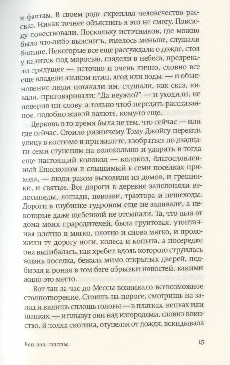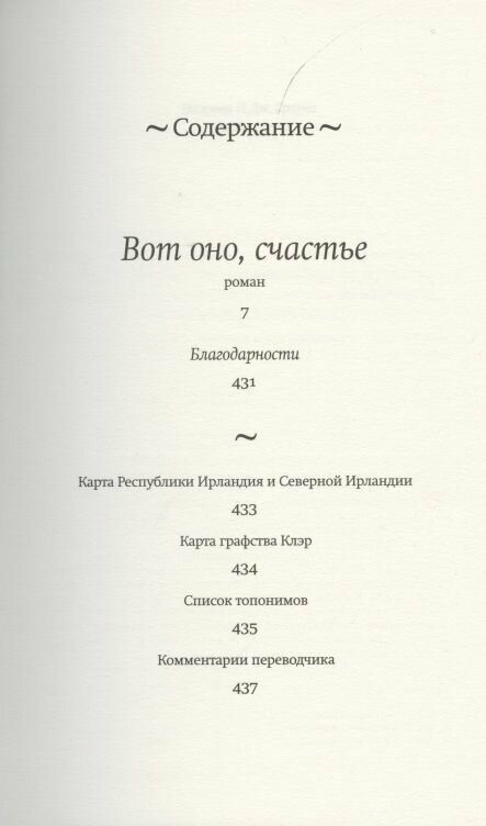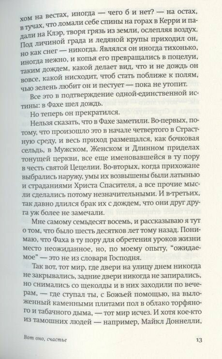 Найлл Уильямз владеет техникой голографического письма, когда целый космос умещается в песчинку и этой же песчинкой выражается. В каждой фразе романа — макрокосм ирландской деревни, которая и есть вселенная, куда вот-вот протянутся электрические провода. «Вот оно, счастье» — забавный, наблюдательный, иногда смешной и неизменно трогательный оммаж безмятежности, которую можно попробовать создать заново. Это роман о взрослении — и отдельных людей, и самого времени как такового. И, конечно, это роман о силе и власти людских историй.