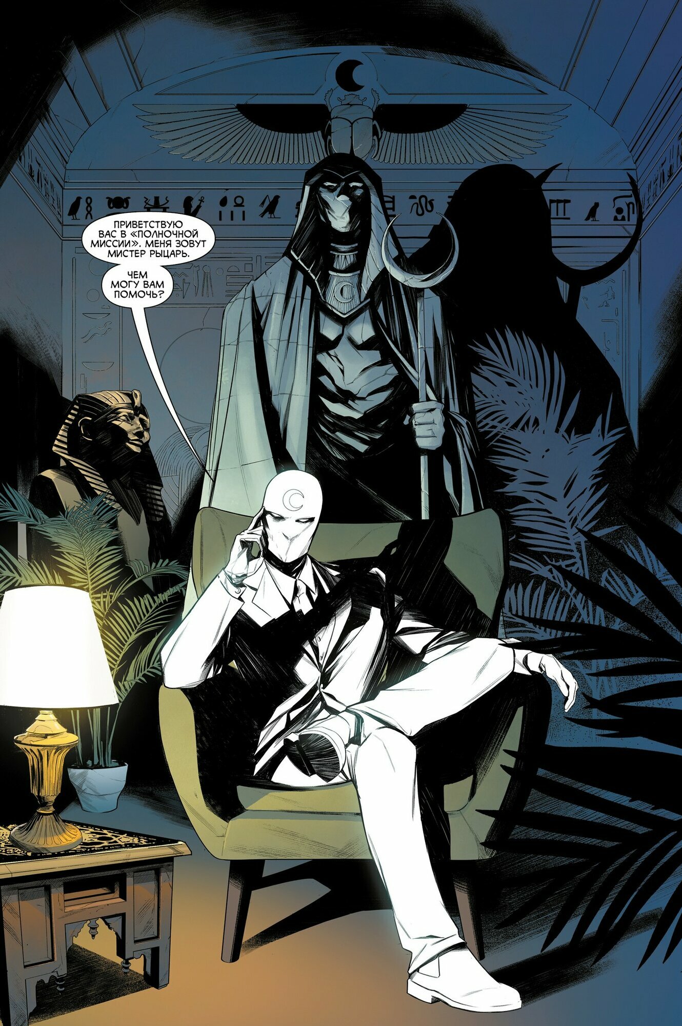 Первый выпуск показывает читателю нынешнюю повседневную жизнь Марка Спектора и даёт за травку на нового антоганиста. Вот и все что нужно знать о содержании этого номера. Для этого тома не нужно читать предыдущие истории о Лунном Рыцаре, что идеально подходитдля нового читателя.