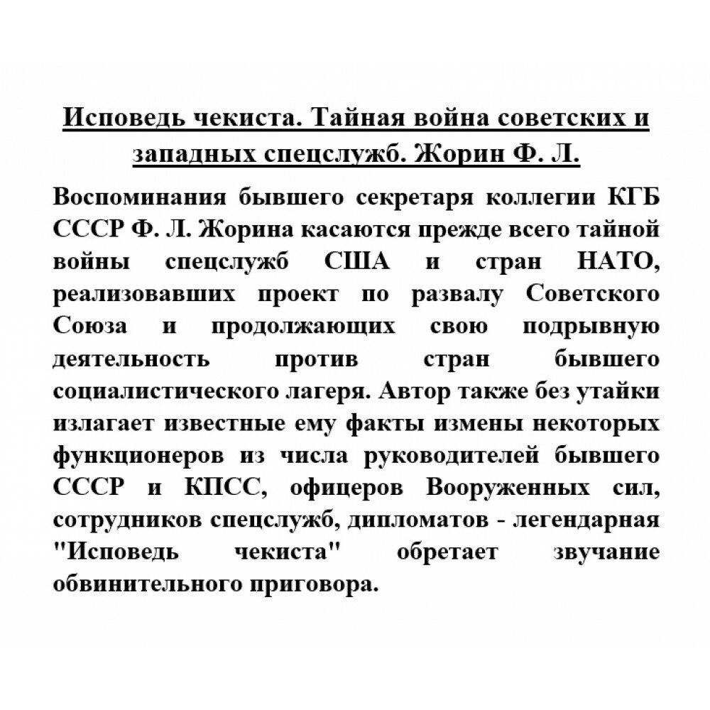 Воспоминания бывшего секретаря коллегии КГБ СССР Ф.Л. Жорина касаются прежде всего тайной войны спецслужб США и стран НАТО, реализовавших проект по развалу Советского Союза и продолжающих свою подрывную деятельность против стран бывшего социалистического лагеря. Автор также без утайки излагает известные ему факты измены некоторых функционеров из числа руководителей бывшего СССР и КПСС, офицеров Вооруженных сил, сотрудников спецслужб, дипломатов - легендарная "Исповедь чекиста" обретает звучание обвинительного приговора.