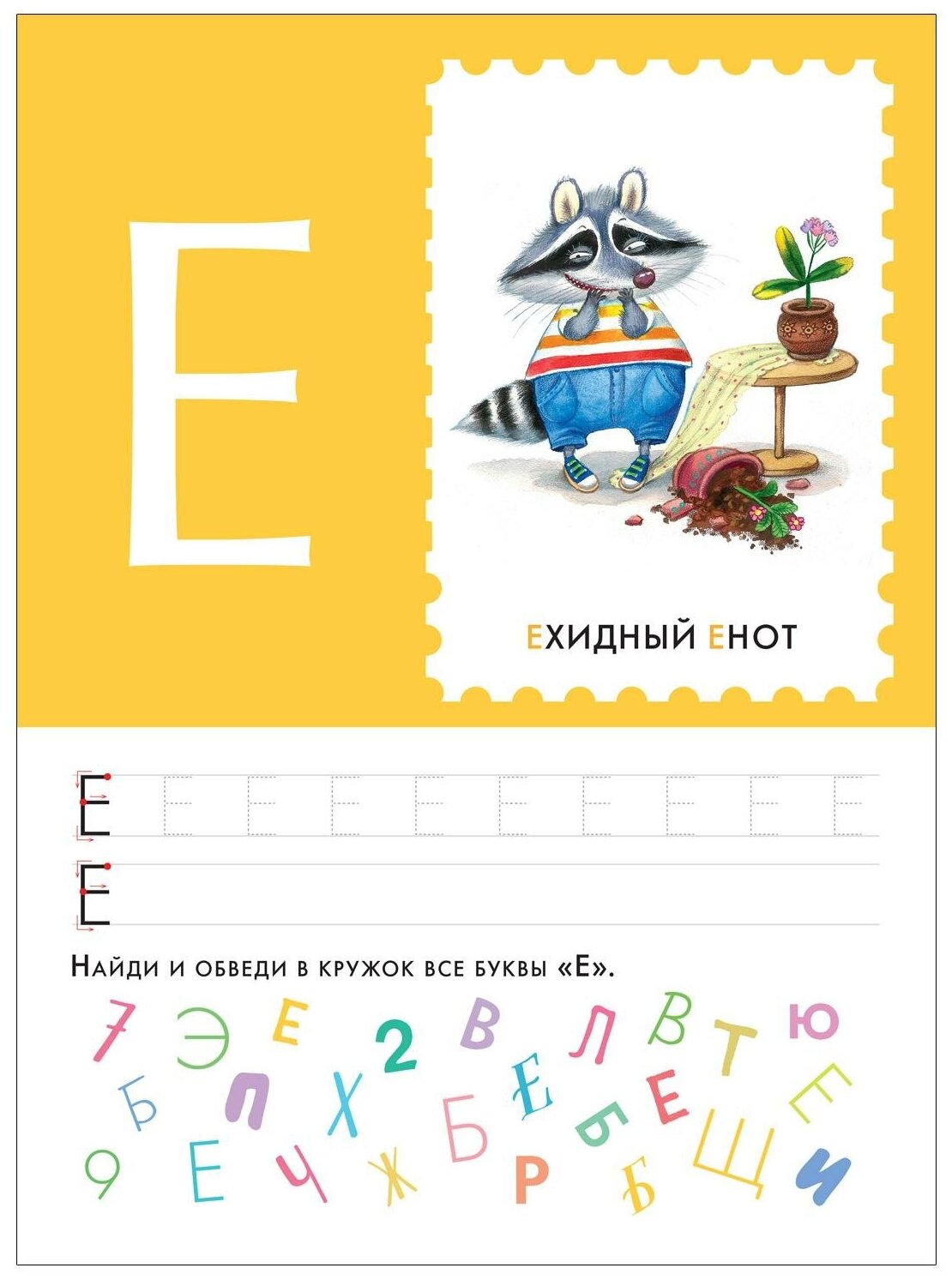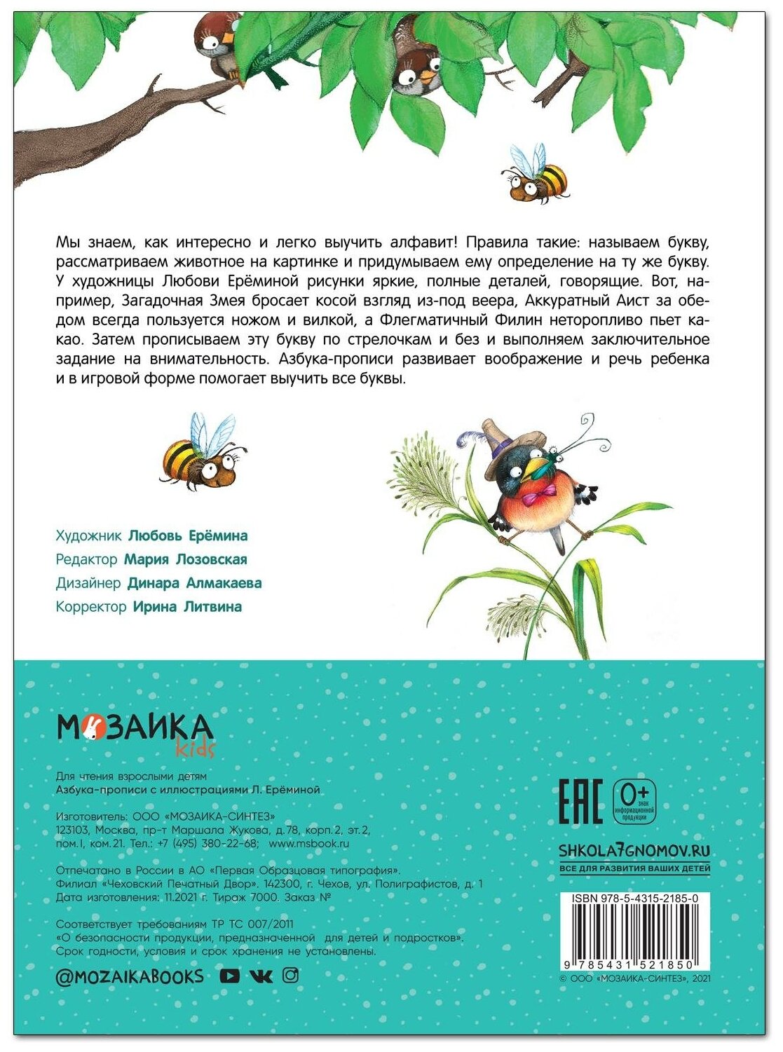 Как сделать так, чтобы ребенок легко и с интересом выучил алфавит? Решение подскажет «Азбука-прописи с иллюстрациями Л. Ерёминой». Правила такие: нужно назвать букву, рассмотреть животное на картинке и придумать ему определение на ту же букву. У художницы Любови Ерёминой рисунки яркие, полные деталей, говорящие. Например, Загадочная Змея бросает косой взгляд из-под веера, Аккуратный Аист за обедом всегда пользуется ножом и вилкой, а Флегматичный Филин неторопливо пьет какао. Затем нужно написать названную букву по стрелочкам и без и выполнить заключительное задание на внимательность. Азбука-прописи развивает воображение и речь ребенка и в игровой форме помогает выучить все буквы.