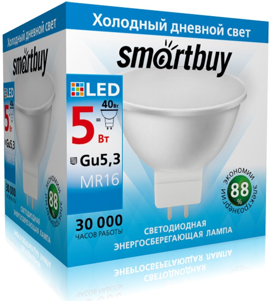 Светодиодная лампа (LED) SmartBuy GU5.3 (MR16) 5W/6000/GU5.3. Светодиодная лампа (LED) SmartBuy GU5.3 (MR16) 5W/6000/GU5.3. Светодиодная лампа энергосберегающая лампа направленного света, широко используется в помещениях — в различных точечных потолочных светильниках, для украшения витрин, в.
