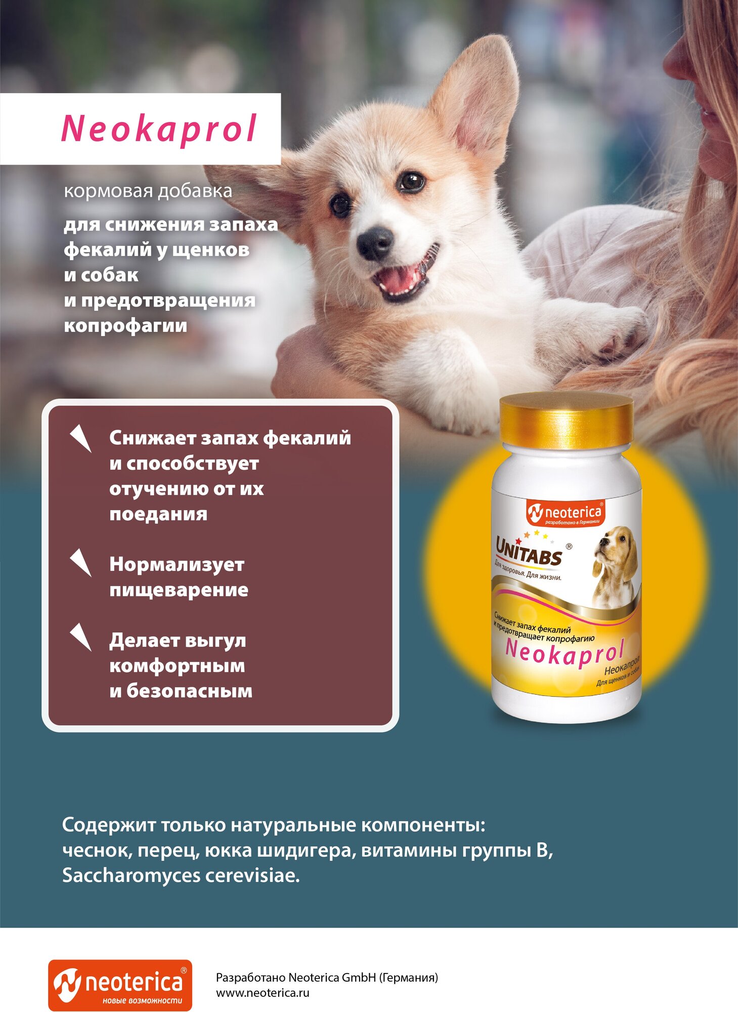 Unitabs Neokaprol – это кормовая добавка для снижения запаха фекалий у щенков и собак и предотвращения копрофагии.