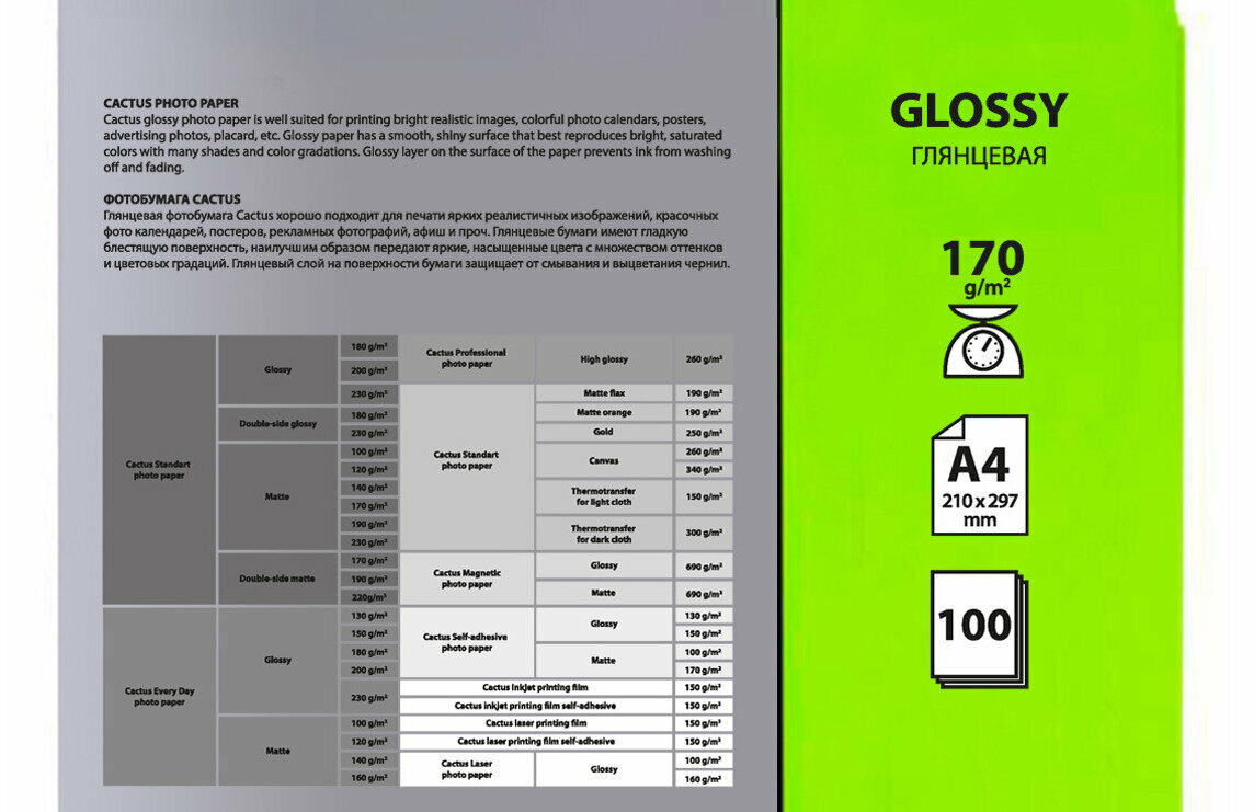 Фотобумага Cactus A4/170г/м2/100л./белый глянцевое для струйной печати