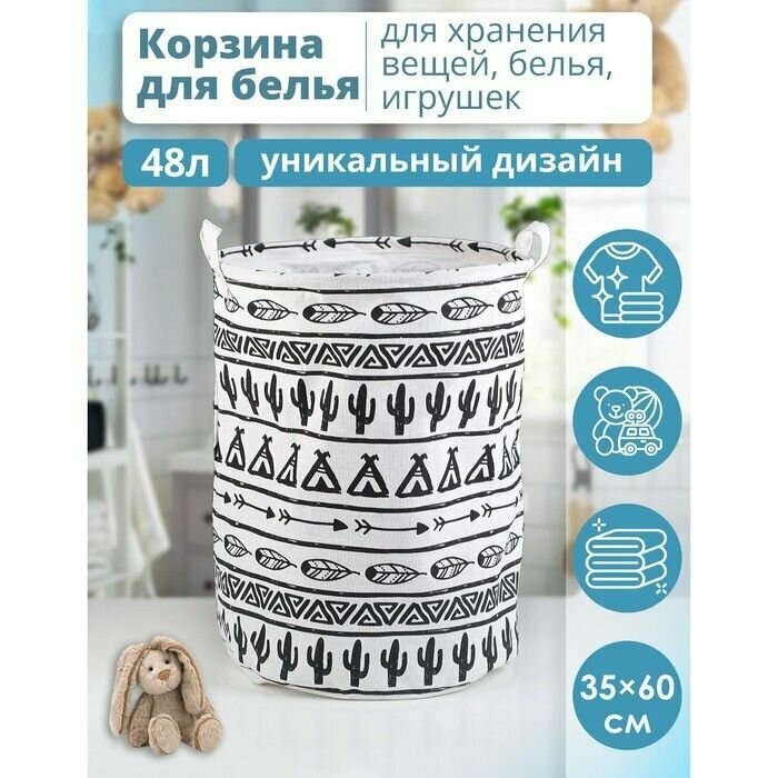 Преимущества. Выполнено из лёгкого текстильного материала. Удобная конструкция: в верхней окружности есть кольцо, которое добавляет жёсткости. Специальная водоотталкивающая пропитка надёжно защищает содержимое от попадания влаги. 2 ручки для удобства переноски корзины. Оригинальный дизайн. Такие корзины можно использовать как для белья, так и для хранения домашн